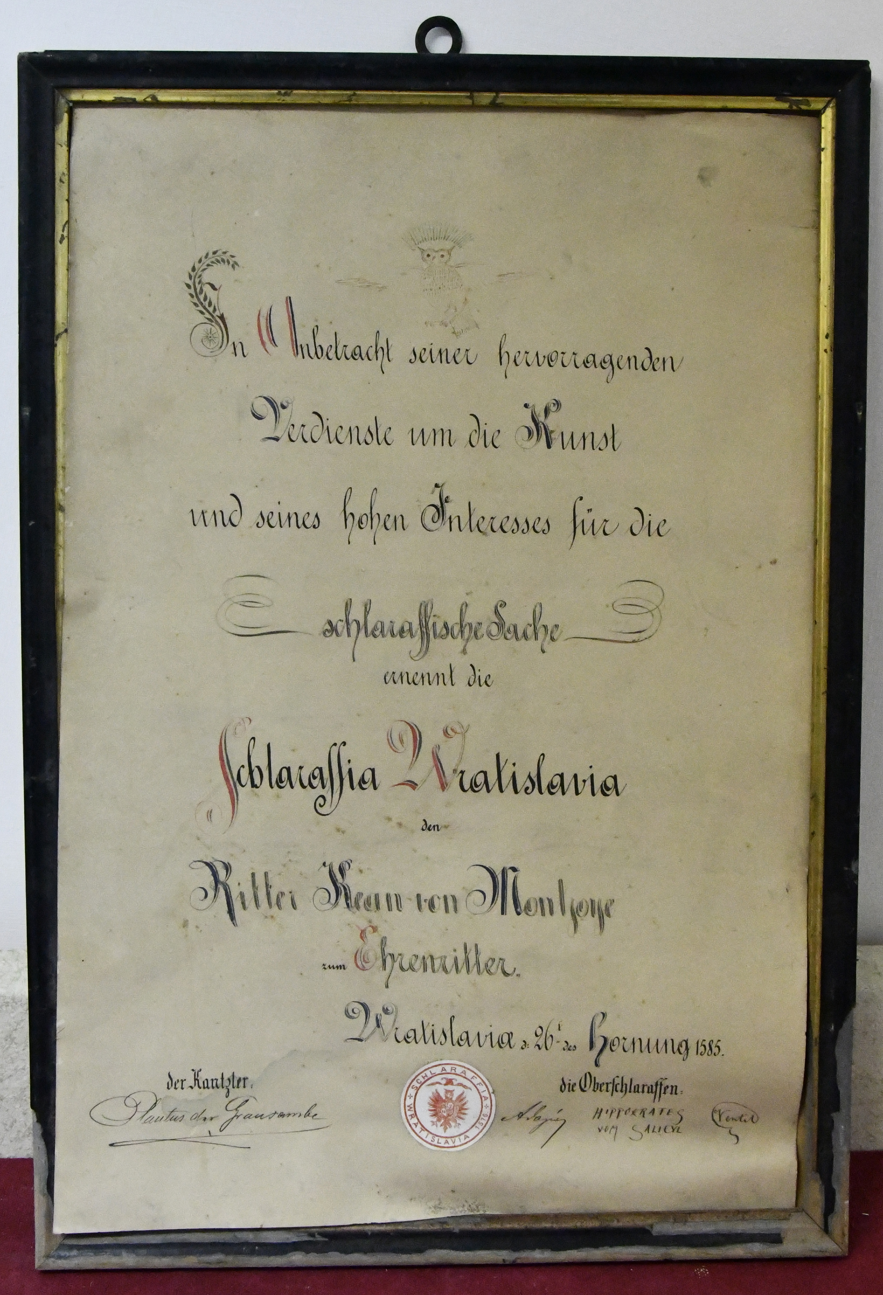 - NOTIZIE STORICO CRITICHE Attestato in lingua tedesca dell'Ordine della Civetta rilasciato a Bratislava ad Ernesto Rossi. Cornice in legno nero e oro. Si tratta di un'altra parte dell'attestato dell'Ordine della Civetta (cfr. scheda n. 79, NCT 09/00669134), dato anziché a Berlino come l'altro, a Bratislava. Anche questo proviene dai magazzini del mercato
