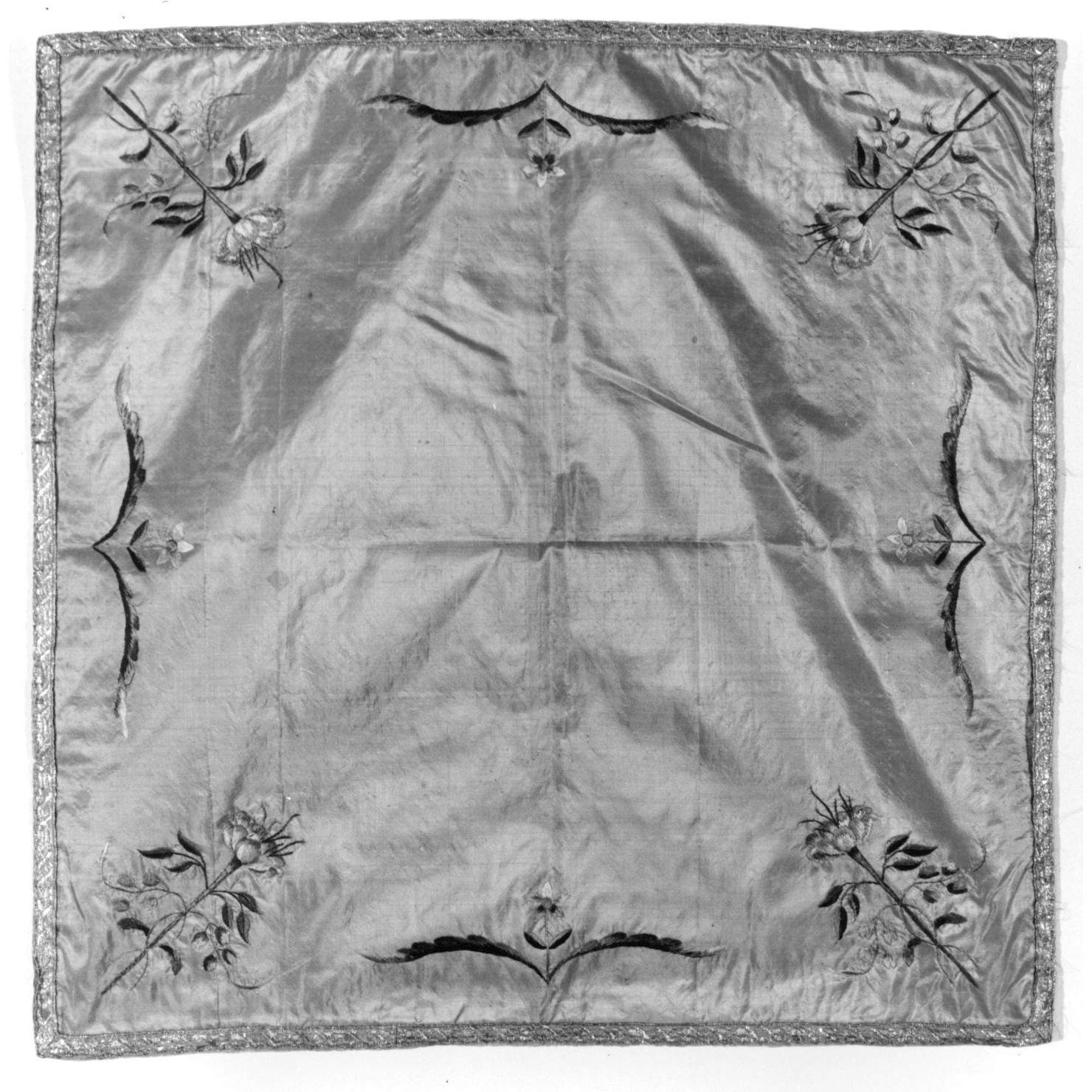 Dagli angoli dell'oggetto partono quattro fiori uguali realizzati in seta policroma e sormontati di da una corolla orientata verso il centro e con rami di piccoli fiori intrecciati fra di loro. Ai quattro lati due grandi foglie con al centro un piccola margherita con due foglie. I fiori sono nei seguenti colori: bianco, rosa chiaro e scuro, viola, lilla, celeste, blu, verde chiaro e scuro, marrone. Fodera: Taffetta di seta rosa coevo. Cucito a mano. Galloni: Se ne riscontra un solo tipo: 1)borda i lati, alto cm. 1,5 gallone con motivo a losanga in argento laminato e seta bianca