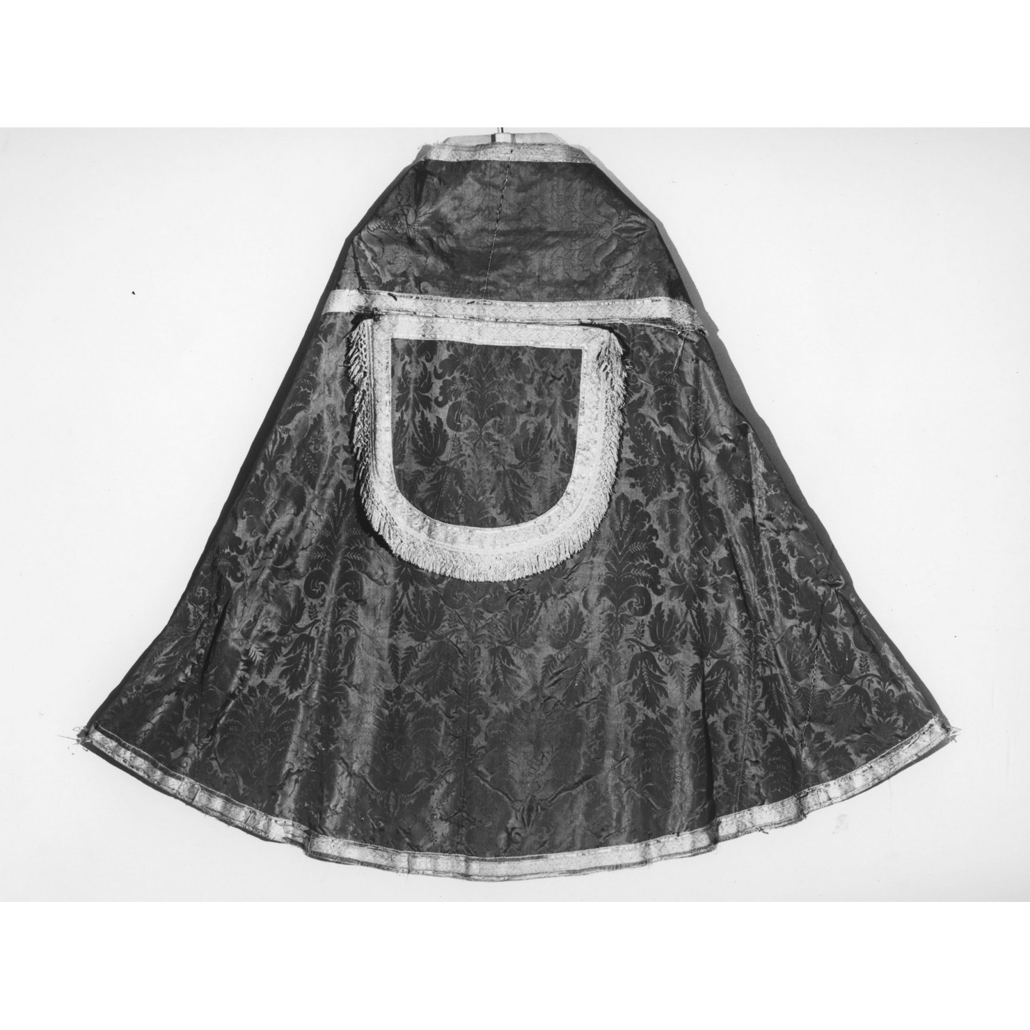 Grande motivo floreale a sviluppo orizzontale, composto da grandi fiori e foglie e da un'elaborazione del motivo della pigna. Fodera: tela di lino cerato viola. Galloni: alto cm. 3.5, in seta gialla e rame dorato con motivi geometrici. Frange postiglionate che bordano il cappuccio, alte cm. 6.5 (testa cm. 1, gonna cm. 5.5.) in seta gialla e rame dorato
