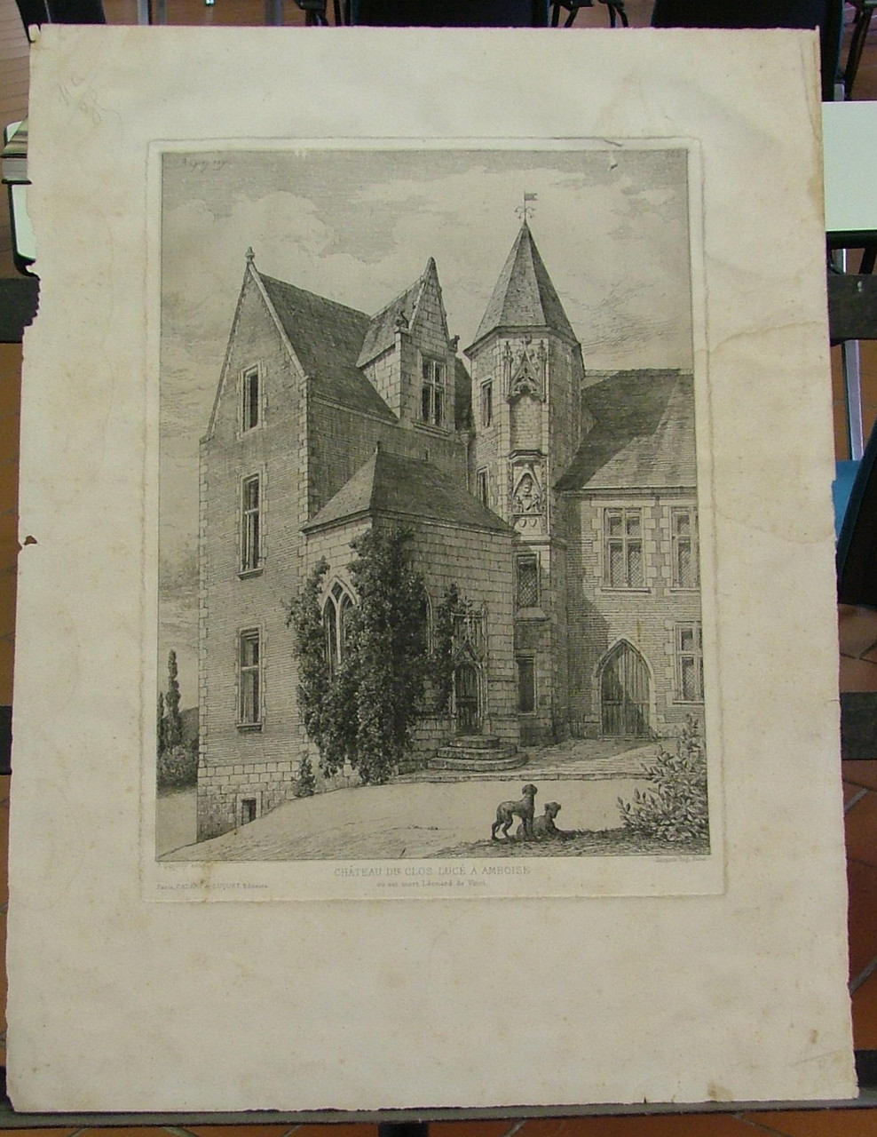 - NOTIZIE STORICO CRITICHE La stampa riproduce il palazzo di Clos Lucé in Amboise in Francia, che si trova vicino al Royal Chateau d'Amboise (una stampa conservata nella bibli oteca civica di Vinci ne riproduce una cappella) al quale è collegata da u n passaggio. Il palazzo fu costruito a metà del XV secolo e divenne poi u na residenza del re di Francia. Nel 1516 il re di Francia vi invitò Leona rdo da Vinci, l'artista vi soggiornò e lavorò negli ultimi tre anni della sua vita e vi morì nel 1519. Quando Leonardo arrivò al Palazzo portò con se alcune sue opere tra cui il dipinto con il San Giovanni Battista (una s tampa conservata nella biblioteca civica di Vinci ne riproduce l'opera). Oggi il palazzo è un museo ed ospita alcuni modelli delle macchine progett ate da Leonardo