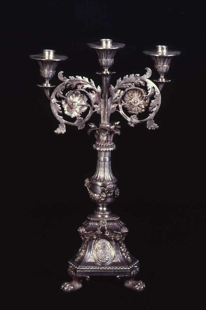 Candelabro a tre fiamme ornato con motivi vegetali, poggia su tre gambi a forma di zampa di leone. Compare l'immagine del Volto Santo