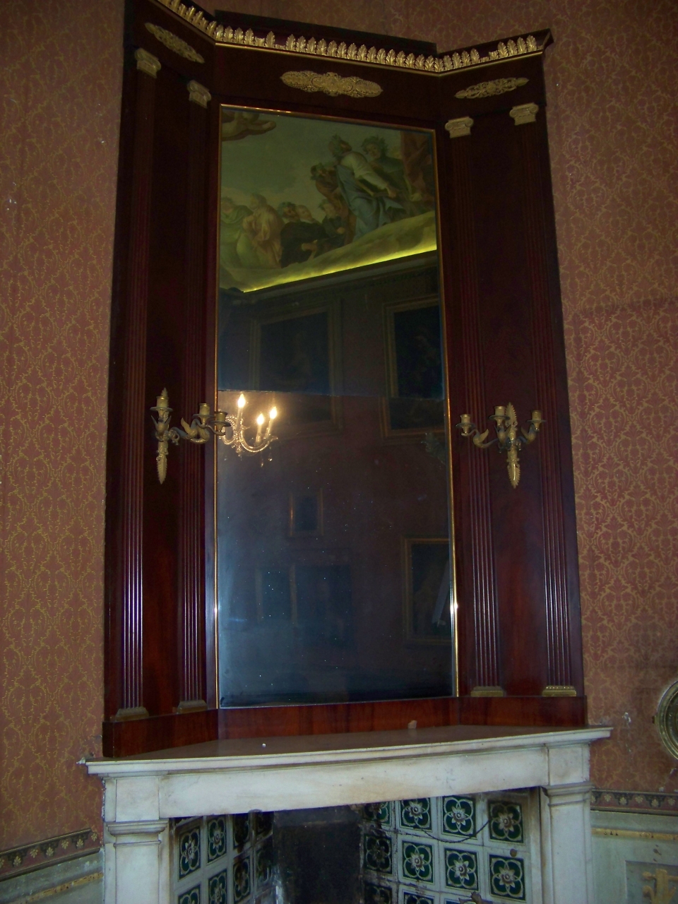 Caminiera d'angolo con specchio centrale incorniciato da due lesene su ciascun lato; cornicione in alto decorato da riporti metallici dorati