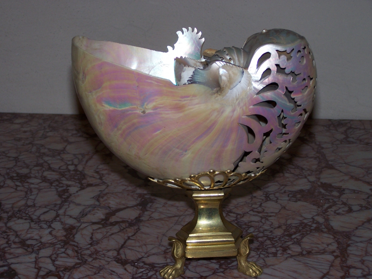 Nautilo intagliato e traforato impostato su base quadrangolare poggiante su piedini di leone con sostegno a coppa traforata