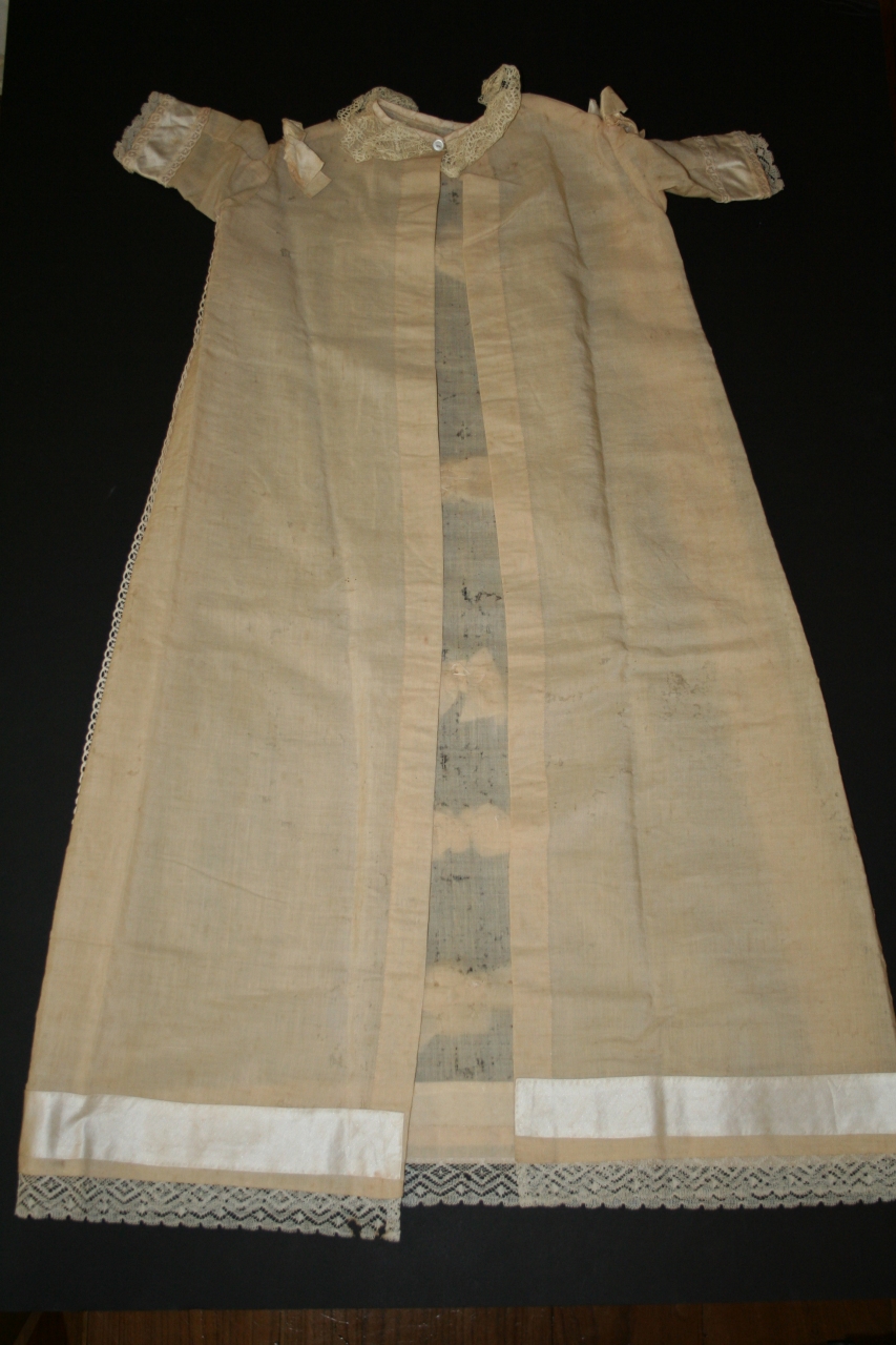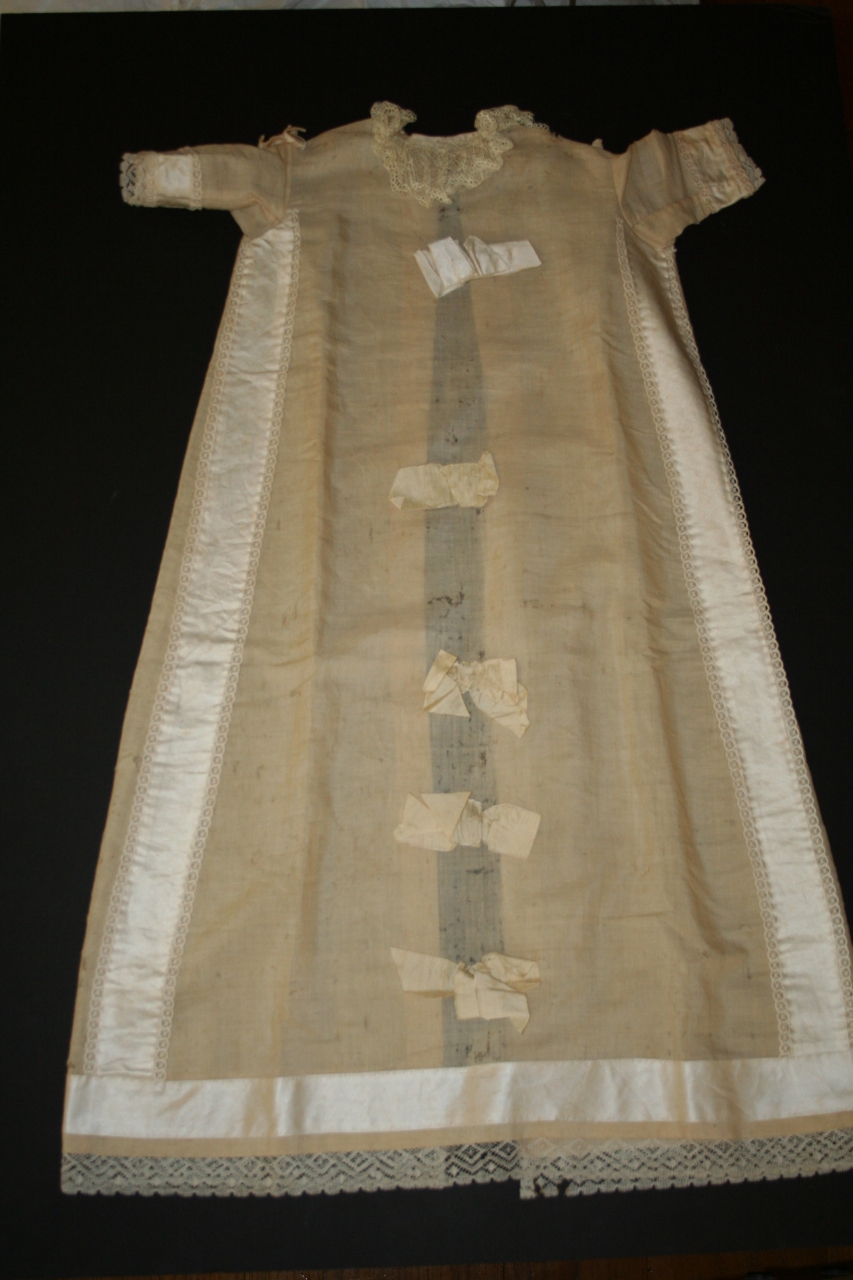 Abito da battesimo di linea svasata, confezionato in tessuto di lino misto canapa color écru, con applicazione di nastri in raso tinta crema - profilati da occhielli - in corrispondenza dell'orlo inferiore, lungo i fianchi e ai polsi. Sul centro davanti sono presenti fiocchi ornamentali di taffetas in tinta (5), posizionati anche a decoro delle spalle (2, uno per parte, ad armatura raso). Apertura totale sul centro dietro, fermata da bottone in madreperla e rispettiva asola rifinita a punto festone rinforzato. Dotato di maniche lunghe aderenti, a pala bassa, e scollo a girocollo orlato da nastrino di raso e bordura in merletto meccanico di cotone, del tipo Leavers con filo di contorno, ad imitazione delle lavorazioni a fuselli; altre bordure meccaniche anche all'orlo inferiore e ai polsi, con decoro a motivi geometrici e losanghe