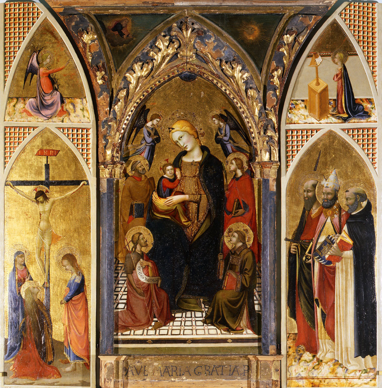 - NOTIZIE STORICO CRITICHE Secondo Tartuferi (in Miniatura '400 2003) si tratta di due sportelli di un tabernacolo. Le due tavole furono collocate ai lati della "Madonna del latte con angeli e quattro santi", opera giovanile di Lorenzo Monaco databile intorno al 1390, alla fine del XV secolo, epoca a cui risale la cornice di collegamento nei cui piccoli pennacchi sono dipinti Dio Padre e la Colomba dello Spirito Santo, andando a comporre un trittico eterogeneo. L'insieme fu acquistato per le Gallerie fiorentine dal Conservatorio di S. Pier Martire a Firenze nel 1899 come lavoro di scuola fiorentina del secolo XIV, e inventariato come opera unica nell'Inventario 1890 (n. 3227). Il dipinto centrale fu pubblicato come opera giovanile di Lorenzo Monaco da Boskovits (1975), che confermava per i due laterali l'attribuzione al Maestro della predella Sherman, già avanzata da Berti (1961). Tartuferi (in Miniatura '400 2003), ripercorrendo la vicenda dell'anonimo Maestro, giudica i due pannelli in oggetto un originale prodotto dell'artista ormai autonomo dopo una probabile formazione presso la bottega di Lorenzo Monaco, da esempi del quale sembrano derivare anche i collegamenti a cassettoncini prospettici posti intorno alle ogive. Kanter (Fra Angelico 2005) pensa che il termine di attività del Maestro della predella Sherman vada esteso oltre il 1430, e ne ipotizza la partecipazione agli affreschi del Chiostro degli Aranci alla Badia Fiorentina e l'identificazione col portoghese Giovanni di Consalvo