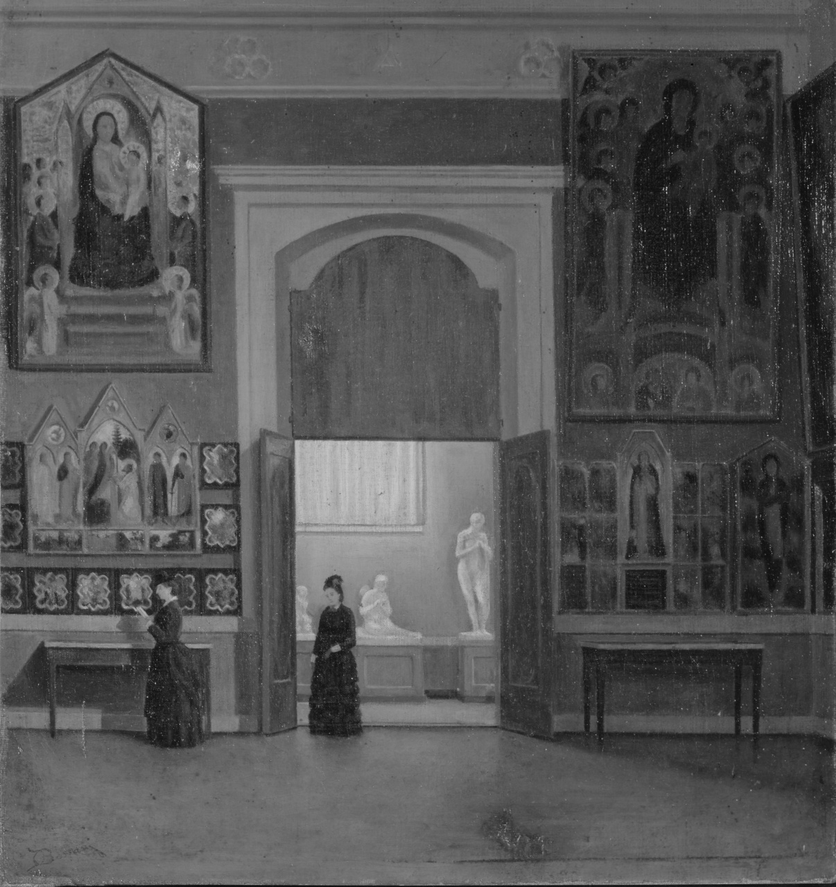 - NOTIZIE STORICO CRITICHE Nel dipinto è raffigurata una sala della Galleria dell'Accademia, allora facente parte del complesso dell'Accademia di Belle Arti, la sala detta "dei quadri grandi", dove tra gli altri dipinti sono riconoscibili la "Maestà" di Cimabue e quella di Giotto (oggi entrambe alla Galleria degli Uffizi). Oltre la porta aperta al centro del dipinto si vede uno scorcio di una sala con modelli in gesso, tra i quali si riconosce "Aconzio" di Ulisse Cambi: doveva probabilmente trattarsi della galleria dove erano esposte le opere premiate ai concorsi Triennali e i saggi di pensionato a Roma, delle quali oggi resta ben poco. Borrani dipinse anche uno scorcio della "Sala dei quadri antichi" in una tela conservata alla Galleria Nazionale d'Arte Moderna di Roma