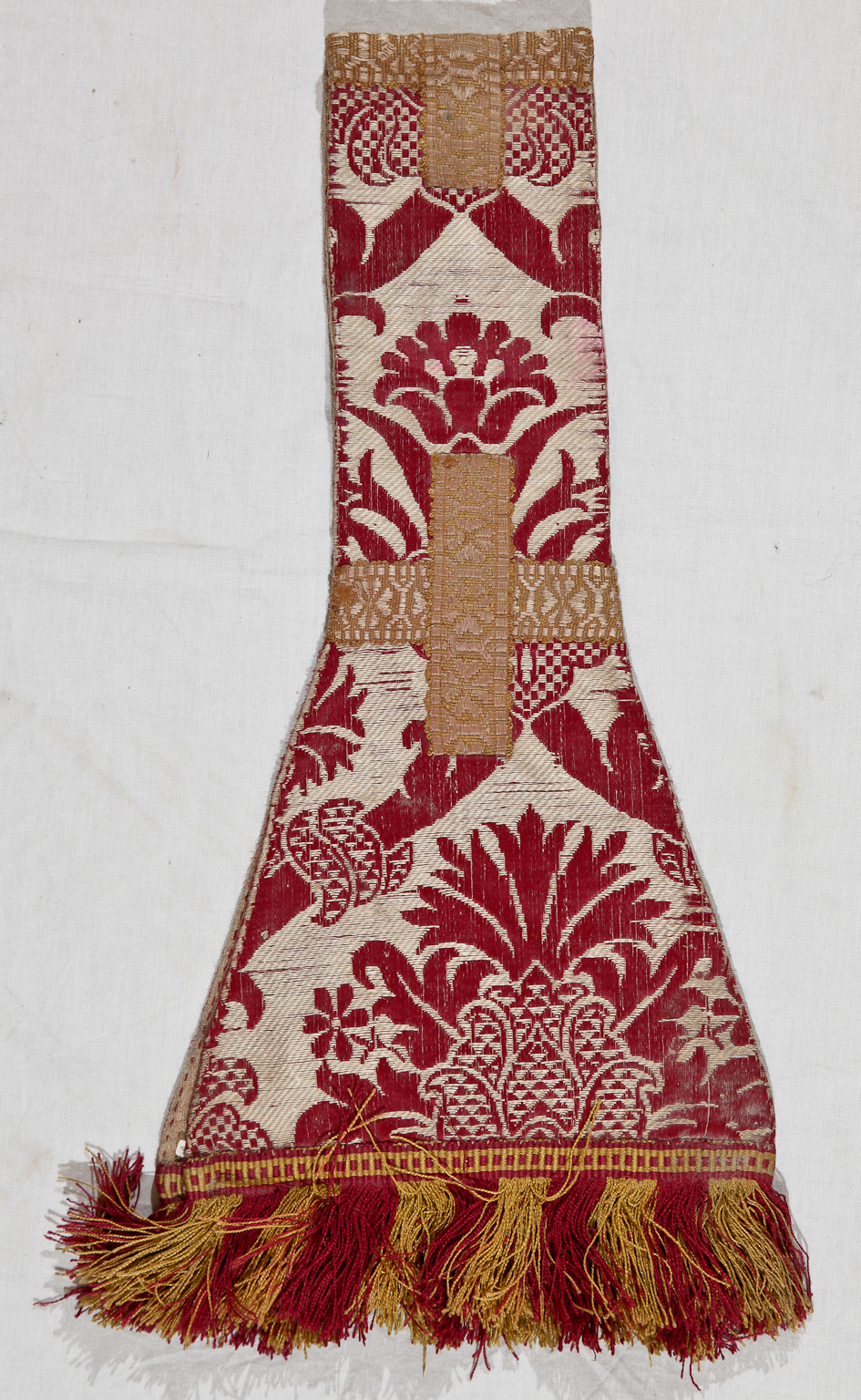 - NOTIZIE STORICO CRITICHE Manipolo confezionato con un tessuto di produzione fiorentina, databile genericamente al XVII secolo. Questa tipologia, definita "a rete e fiori di cardo", è caratteristica delle manifatture cittadine che la produssero dal XVI al XVII secolo, con soluzioni disegnative quasi invariate e con tecniche tessili che variavano dal velluto, al damasco, al broccatello. Questo consentiva la produzione di manufatti più economici, senza rinunciare all'impatto decorativo ormai consolidato di questa tipologia, simbolo di ricchezza e prestigio