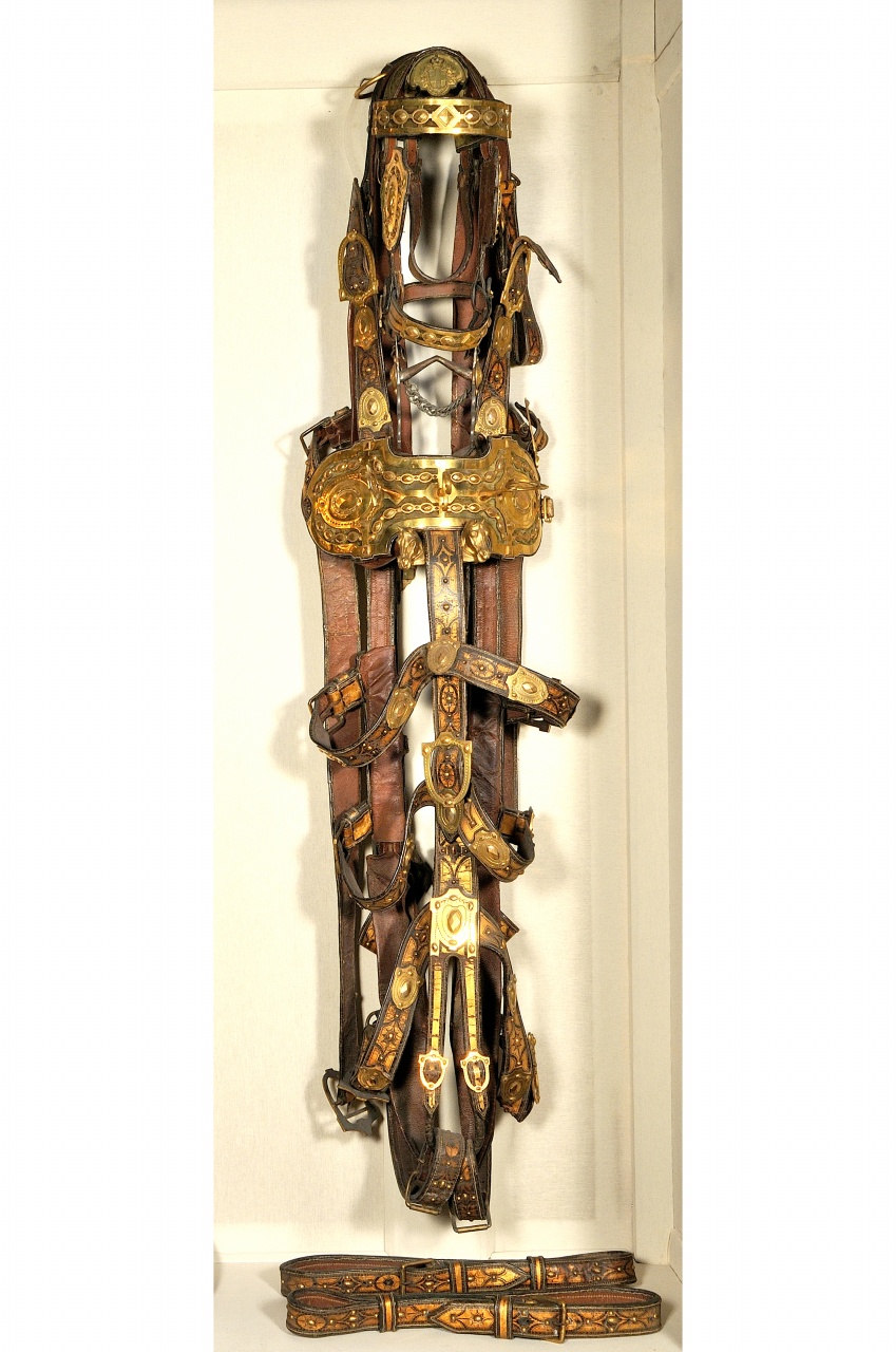 Serie di finimenti da gala in cuoio. L'impuntura esegue un disegno floreale stilizzato ornato da motivi geometrici. La pariglia è tutta decorata da borchie di bronzo cesellato e dorato. Le testiere sono guarnite nel frontale e nelle museruole delle piccole borchie. I paraocchi dello stesso corame, recano esternamente placche di bronzo dorato con stemma sabaudo. In alto sul frontale stemma sabaudo in bronzo dorato. Morsi a barbazzale in ferro stagnato
