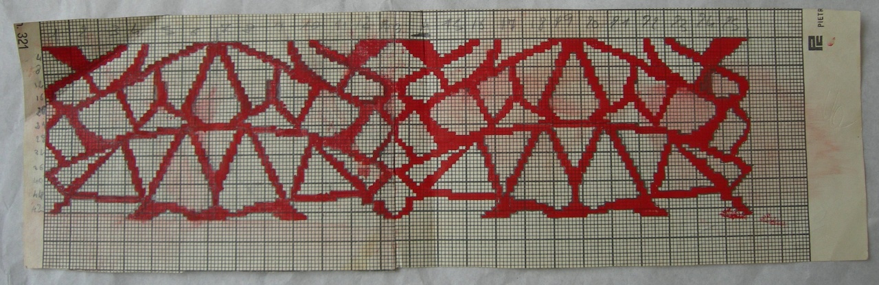 Carta tecnica 8 in 8, composta dall'unione di due fogli, con disegno realizzato a lapis e dipinto con tempera rossa. I numeri corrispondenti alle quantità delle corde e dei passi sono riportati a lapis