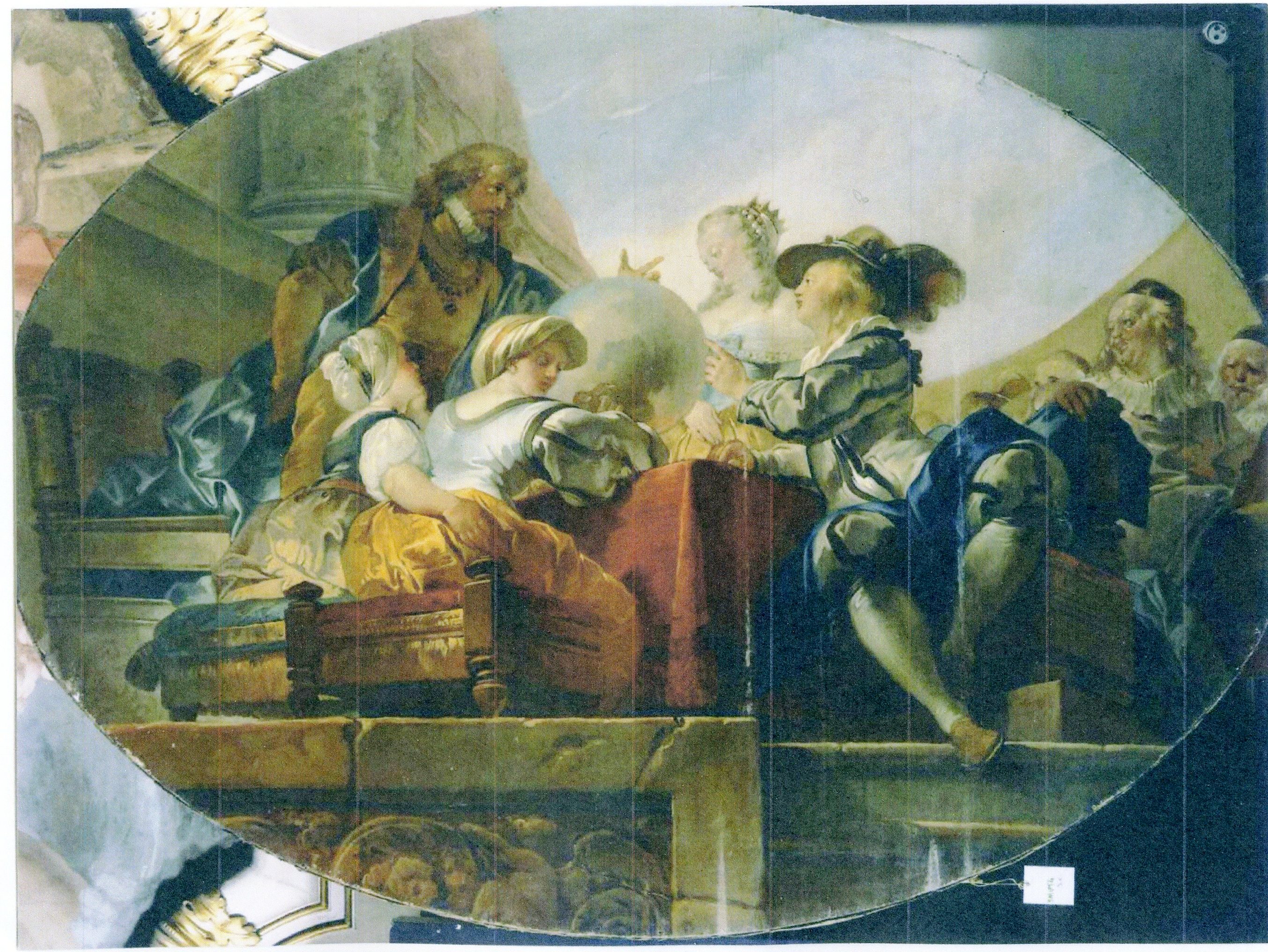 - NOTIZIE STORICO CRITICHE "Il dipinto in oggetto è stato più volte pubblicato e commentato dagli specialisti. Gli studi hanno indicato da tempo in quest'artista assai originale e versatile uno dei principali precursori della tendenza romantica per la pittura storica e neomedievale. Questo grande dipinto, che con ogni probabilità apparteneva in origine ad un ciclo più vasto, raffigura verosimilmente il colloquio del grande navigatore genovese con i reali di Spagna, allo scopo di ottenere il finanziamento per il suo ambizioso progetto. L'opera, di raffinata esecuzione, è sospesa in bilico fra accenti formali tardobarocchi, fortemente velati di richiami alla grande tradizione veneta (Veronese; Giambattista Tiepolo) nonchè alla pittura francese coeva, e a precoci prefigurazioni del gusto romantico. Del dipinto sono noti due disegni preparatori conservati, rispettivamente, al Musée des Arts Décoratifs di Lione e al Museum of Modern Art di Filadelfia. Considerata la notevole qualità intrinseca dell'opera, appartenente in origine con ogni probabilità ad un'importante impresa decorativa per qualche palazzo patrizio nella Roma del secondo Settecento, e tenendo conto inoltre del particolare ruolo storico giocato da questa personalità artistica, si ritiene di negare la concessione dell'Attestato di libera circolazione e avviare il procedimento di Dichiarazione". Dott. A. Tartuferi, Soprintendenza SPSAE e per il Polo Museale della Città di Firenze. [Antonhy M. Clark ritiene che la tela fosse destinata ad un soffitto e la data attorno al 1789 (Clark 1964, pp. 23 s.)]