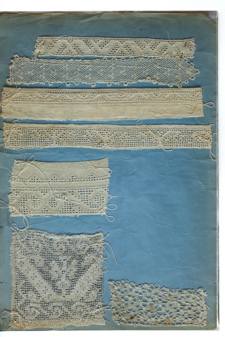 I pagina A bordo a fili tirati su tela grossa di lino dove sono stati creati vuoti raggruppando con punto rammendo i fili, il disegno è a motivo geometrico, disposto secondo uno schema compositivo simmetrico; bianco e ocra (10 x 33); B Simile per tecnica al precedente è decorato da una greca geometrica con elementi trasversali, fatti risaltare dall'abbinamento cromatico: bianco e ocra (7 x 33); C Bordo a punti tagliati derivato dall'aver tolto fili di ordito o di trama o di entrambe, con il disegno 'isolato', dove il fondo della stoffa è nascosto o copertio dai punti ad esclusione nelle parti dove risalta il disegno creato dalla stoffa: ricamo in bianco a punti sfilati e tagliati (8 x 29); D-Bordo di merletto a fuselli con motivo a nastro ondulato e unito nei punti di tangenza da armellette (9 x26); II pagina A bordo a fuselli a punto tela con disegno continuo a piccoli occhielli uniti da trecce di quattro fili (6 x 12); B ricamo in bianco a sfilato e punto rammendo a motivo geometrico creato dalla tela di fondo (12 x 12); C Ricamo a punto tagliato con un motivo di forme ad S tangenti, creati dalla tela non ricamata e su un fondo a rete a maglie quadrate (8 x 13); D simile al precedente per tecnica con un disegno a greca creato dalla tela su fondo a punto tagliato (3 x 27); E
