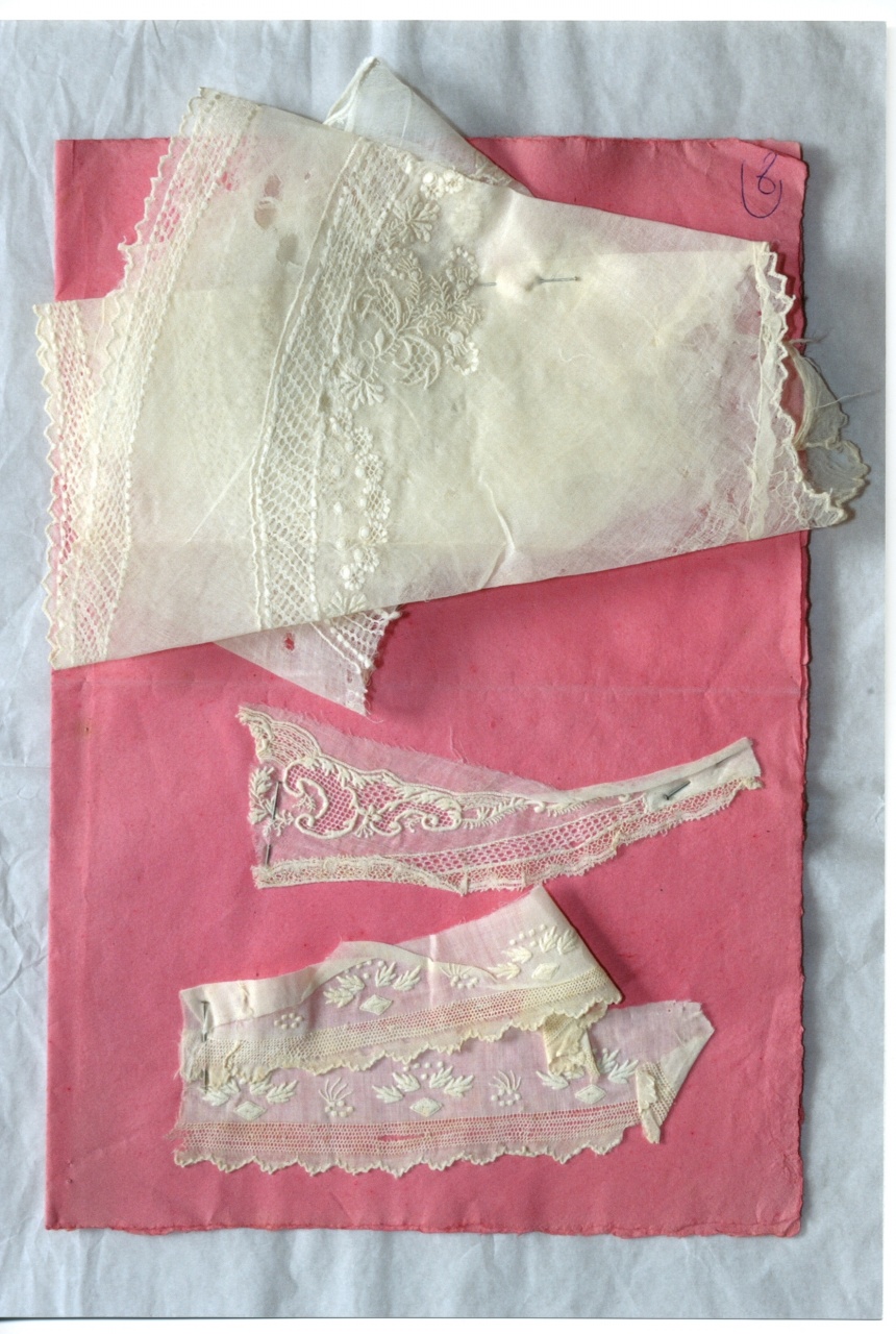 - NOTIZIE STORICO CRITICHE A- Il pezzo di forma stondata sembra parte di un ampio colletto nel gusto del II quarto del XIX secolo,allorché si impongono sottili motivi naturalistici. La forma fa presupporre che si tratti di un pezzo ottocentesco, utilizzato nel laboratorio Marilla come guida ai lavori su mussole e batiste ricamate in bianco, ma la lavorazione appare assai simile ai campioni di prova del laboratorio stesso. A bis- Il grazioso motivo decorativo sembra ispirarsi ai dinamici decori vegetali di gusto Liberty e risulta un interessante tentativo di rinnovare il repertorio del ricamo in bianco su tela leggere, dove generalmente si utilizzano motivi settecenteschi o del periodo romantico. B Il piccolo frammento riporta un motivo decorativo in voga nel XVIII secolo nello stile Luigi XV, allorché queste cornici ondulate, variamente riempite erano parte integrante del repertorio Rococò e venivano fatte con i più svariati materiali. Presenta caratteri esecutivi,nell'elaborazione dei retini e nei punti passati e pieni, molto simili agli altri esemplari della pagina di campionario.C- Il disegno grazioso recupera l'impostazione tardo settecentesca ancora in uso nei primi decenni del XIX secolo, basata sulla simmetrica e regolare alternanza di due motivi,uno di ispirazione naturalistica, l'altro di invenzione. Questo genere di composizione è rimasta a lungo caratteristica del settore della biancheria infantile e femminile, indicando la difficoltà del Novecento a rinnovare i disegni