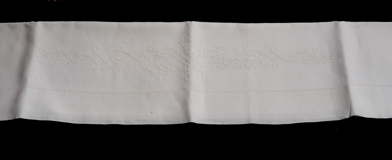 Tela di lino bianca ricamata in cotone; ricamo a punto ombra, punto a giorno lungo orli.Il lenzuolo, completo di federa Inv. Stoffe 12075 presenta in decoro disposto lungo l'orlo, nella parte centrale della rovescia. L' ampio intreccio è creato dal percorso di una cordella che si dispone in un'ampia griglia quadrangolare centrale e culmina in stilizzati elementi vegetali a palmetta. Da questa parte centrale si dirama, ad andamento orizzontale, il percorso della cordella che crea nodi e acquista dimensioni ridotte, fino a concludersi in una stilizzata palmetta. Gli orli dell'esemplare sono rifiniti a punto a giorno