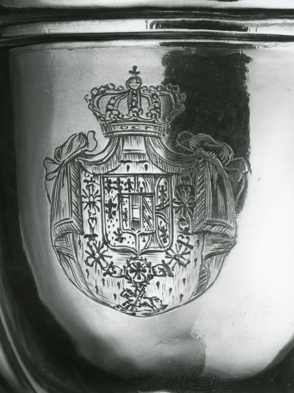- STEMMI sul corpo della brocca - Stemma - Maria Luigia d'Asburgo Lorena, duchessa di Parma - Scudo sannitico sotto padiglione di ermellino condito da corona ducale di Parma. Lo scudo è circondato dal collare dell'ordine costantiniano di San Giorgio ed è diviso in due parti: a destra cinque gigli (Farnese), a sinistra croce e quattro aquile (Guastalla). Sovrapposto al centro lo scudo Asburgo: a sinistra leone rampante coronato, al centro tre fasce orizzontali, a destra banda con tre alerioni