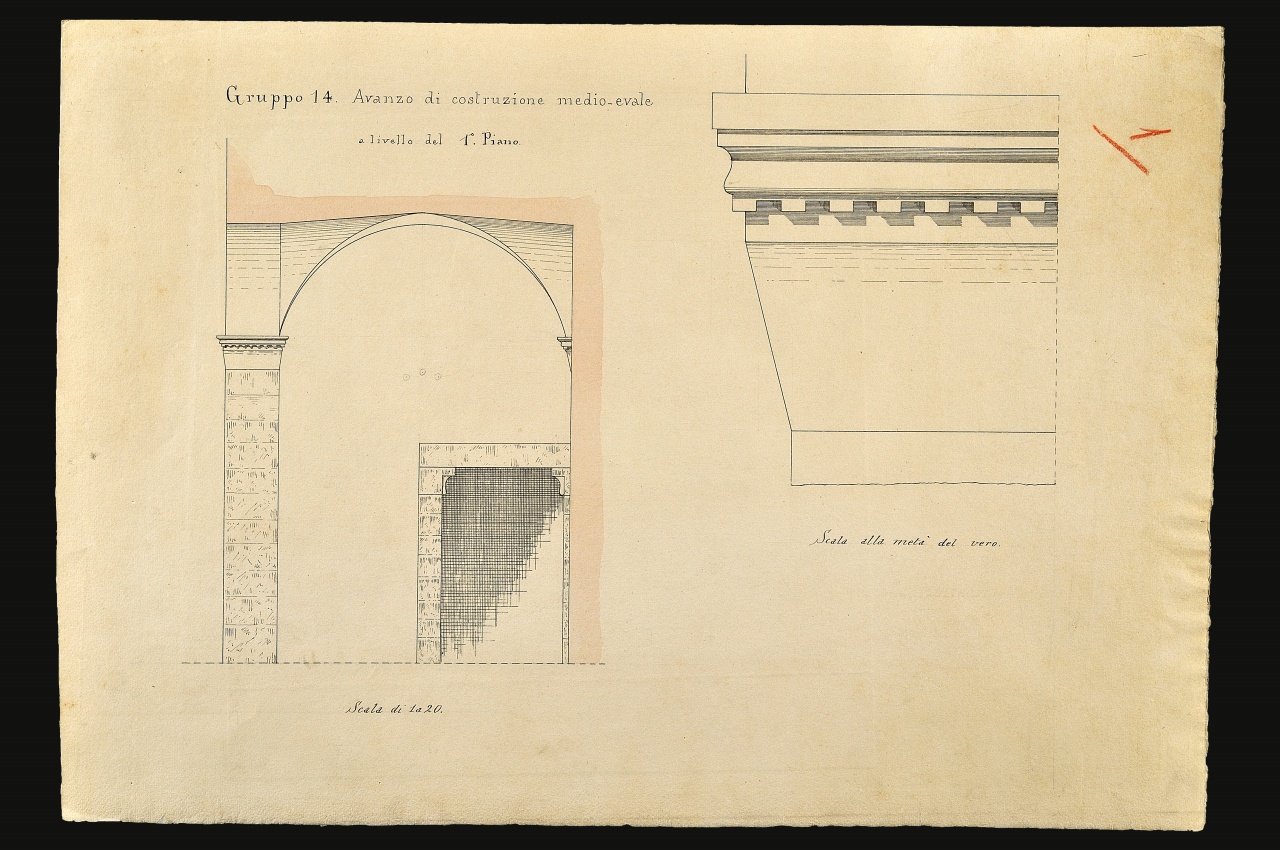 - NOTIZIE STORICO CRITICHE Il disegno di Giuseppe Landi (come indicato nella fotolitografia n. cat. 09/00749875), rappresenta i resti architettonici di un edificio medievale ritrovati in una casa della famiglia de' Nobili in via de' Lontanmorti. E' probabilmente da identificarsi col capitello (catalogato 09/00297750) conservato al museo di San Marco di forma trapezoidale, in pietra forte, ornato a dentelli, il capitello raffigurato nel disegno in scala 1/2. Dopo lo scioglimento dell'Ufficio Tecnico di Vigilanza della CommissioneStorica Artistica Comunale, diretto dall'architetto Corinti e incaricato dal 1892 al 1895 di documentare con disegni, rilievi e fotografie "le cosemedievali e altre di interesse storico artistico" durante le demolizioni dell'antico centro storico di Firenze, l'ingegner Landi, chiamato a collaborare con la Commissione, tra il gennaio del 1896 e il maggio del 1897 eseguì disegni, piante, appunti grafici, misurazioni e fotografie dei particolari architettonici e delle decorazioni murali in particolar modo nell'isolato tra via Calimara, via Porta Rossa e via Pellicceria. Gli elaborati grafici venivano spesso litografati in più copie e inviati ai membri della Commissione. Proprio nel rapporto n. 79 del periodo tra il 1 gennaio e il 31 maggio 1896 il segretario G. Conti scrisse al presidente della Commissione che in quel periodo era stato "preso ricordo al vero di una cornice di marmo di carattere medievale, scoperta nell'interno di un muro, e di un frammento di fregio ed architrave in pietra e del peduccio di una volta"