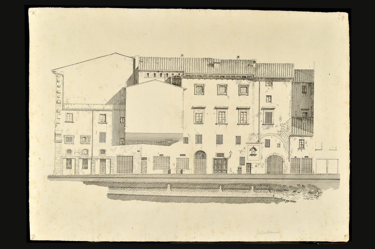 - NOTIZIE STORICO CRITICHE Nel disegno, datato 20 febbraio 1893 e firmato da Fabrizio Lucarini,fotolitografato, viene raffigurato il rilievo delle preesistenze su viadell'Arcivescovado. Esso fa parte del gruppo di quasi 400 rilievi eseguitidalla Commissione Storica Artistica Comunale che fu incaricata dal 1892 al1895 di documentare con disegni, rilievi e fotografie "le cose medievali ealtre di interesse storico artistico" durante le demolizioni dell'anticocentro storico di Firenze. Le fotolitografie vennero allegate ai "rapportisettimanali" che il Corinti, direttore dell'ufficio tecnico, inviava alpresidente della Commissione dal giugno 1894 al dicembre 1895. Laraffigurazione in esame è riprodotta anche nel rilievo n. 35 e nel n. 41che riporta l'indicazione "28/1 Facciata a ponente sulla viadell'Arcivescovado con la strada romana e relativo fognone". La partesuperiore del Vescovado con il cavalcavia col tetto a capanna, il retrodella torre dei Visdomini, la volta che si apriva davanti all'ingressodell'Arcivescovado vennero rappresentate anche nella fotografie (CSAC 51,52, 53, 173) scattate nel gennaio del 1893 e l'ultima nel gennaio del 1894pubblicate da M. Sframeli in Firenze 1892-1895 (n. 258-261)