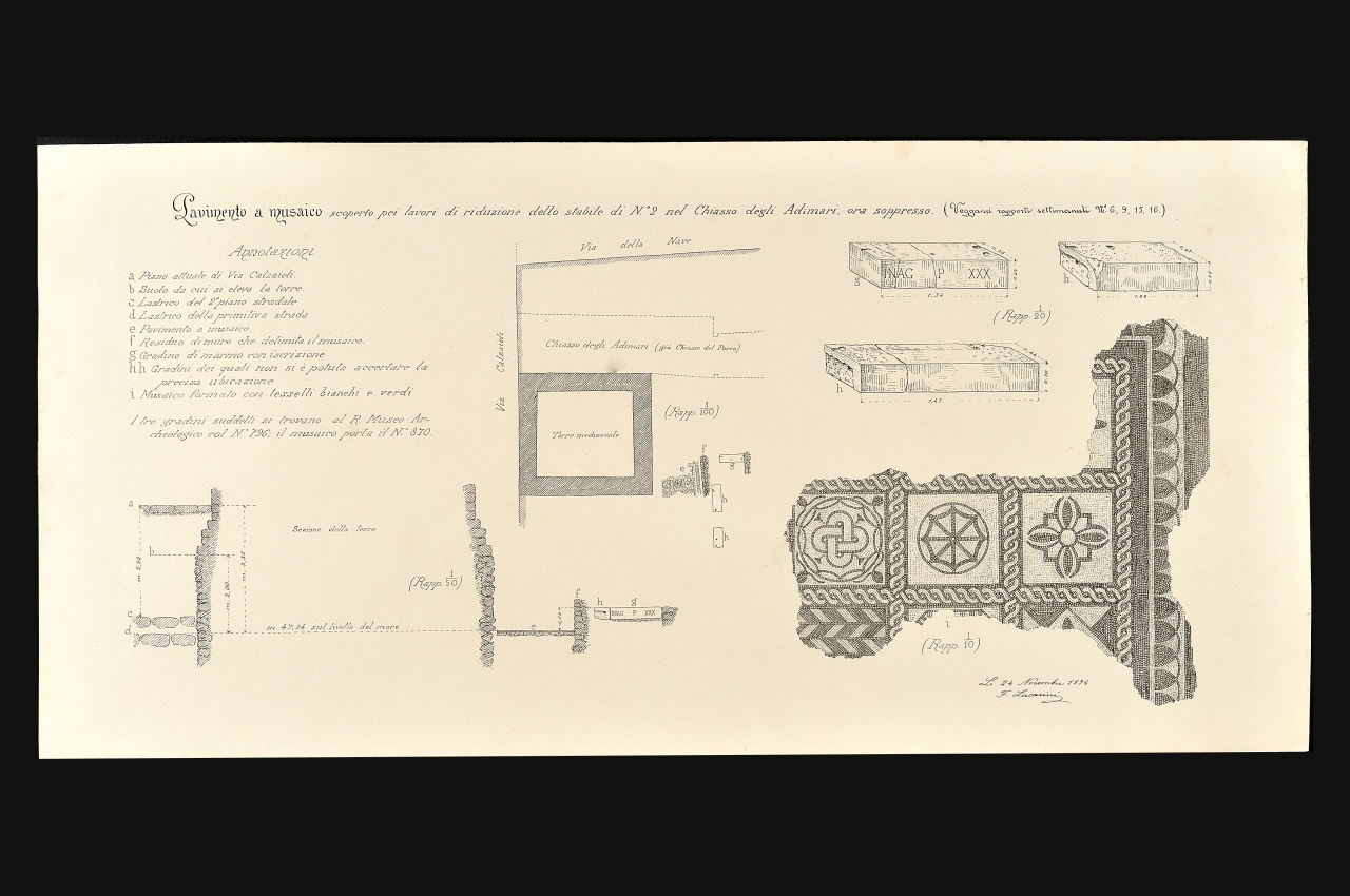 - NOTIZIE STORICO CRITICHE Nel disegno, datato 24 novembre 1894 e firmato da Fabrizio Lucarini, fotolitografato, viene raffigurato il pavimento a mosaico a formelle quadratecon decorazioni geometriche rinvenuto durante i lavori sotto lo stabile al N.2 nel Chiasso degli Adimari, già Vicolo del Porco; la pianta dell'angolo di via Calzaioli con la torre e il mosaico; un gradino con iscrizione ealtri due dei quali non era possibile individuare l'ubicazione. Il disegno fa parte del gruppo di quasi 400 rilievi eseguiti dalla Commissione Storica Artistica Comunale che fu incaricata dal 1892 al 1895 di documentare con disegni, rilievi e fotografie "le cose medievali e altre di interesse storico artistico" durante le demolizioni dell'antico centro storico di Firenze. Le fotolitografie vennero allegate ai "rapporti settimanali" che ilCorinti, direttore dell'ufficio tecnico, inviava al presidente della Commissione dal giugno 1894 al dicembre 1895. La fotolitografia venne allegataalla relazione n. 23 della settimana tra l'12 e il 18 novembre 1894, inviata il 24 novembre, nella quale il Corinti specificava: "È stato assicuratocon cemento sopra un graticciato di ferro il mosaico già trovato presso il Chiasso degli Adimari. A tale oggetto fu tolto lo smalto sul quale per il secolare rammollimento dell'impasto più non aderiva. Adesso il mosaico può vedersi al R. museo Archeologico fra le altre cose del Centro. Un disegno di detto mosaico viene unito al presente rapporto". Già in diversi rapporti precedenti ("Veggansi i rapporti settimanali n. 6, 9, 15, 16" è scritto nell'intestazione della stampa in esame) il Corinti aveva segnalato ilritrovamento lungo il soppresso vicolo del Porco di diversi frammenti di un gradino in marmo con iscrizione (rapporto settimanale n. 6), di "due lastrici dell'antica via" sotto il piano stradale di via Calzaioli (rapportosettimanale n. 9) e del mosaico (rapporto settimanale n. 15) ritrovato nella casa al civico n. 2, alla profondità di 3.30 metri, sotto il piano stradale, tagliato dalle fondazioni della torre di via Calzaioli, poi rimossoe trasportato al R. Museo Archeologico (rapporto settimanale n. 16)