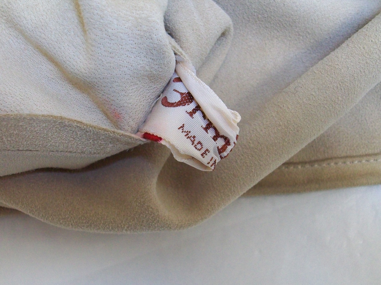 Completo femminile da giorno costituito da casacca e pantaloni. Casacca a vita bassa, di linea diritta, con scollo a barca e maniche corte raglan. Apertura con cerniera sulla spalla sinistra (cm 14). Pieghe piatte sul petto (6 per parte). Sono presenti sul busto due tasche applicate rettangolari con patta. Confezionata in pelle scamosciata beige chiaro con inserto in pelle grigia in corrispondenza delle spalle. Lungo il fianco destro è presente un'etichetta che ne attesta la provenienza sartoriale. All'etichetta è a sua volta fissato un sigillo di garanzia