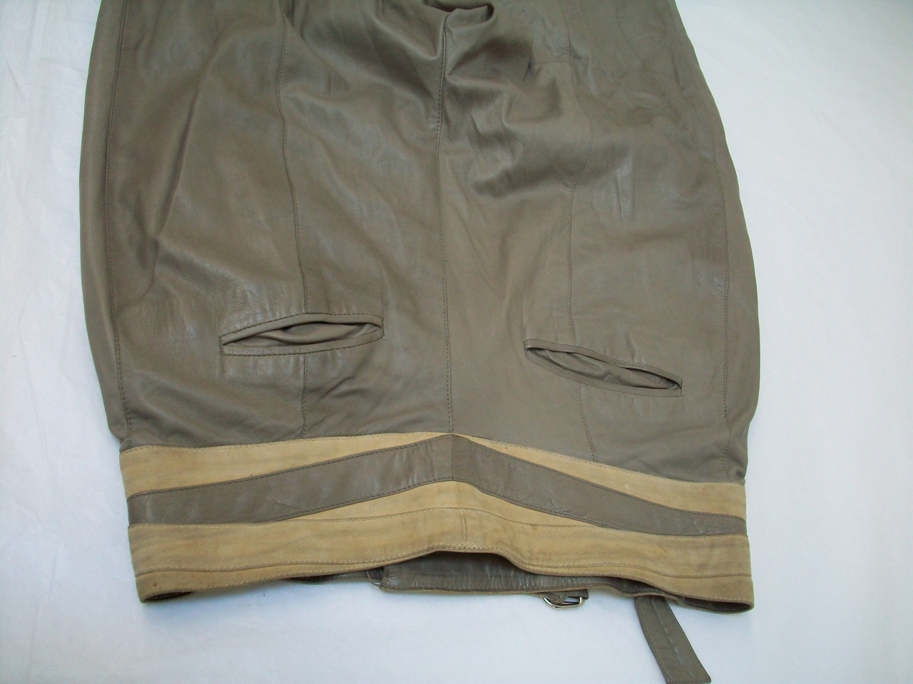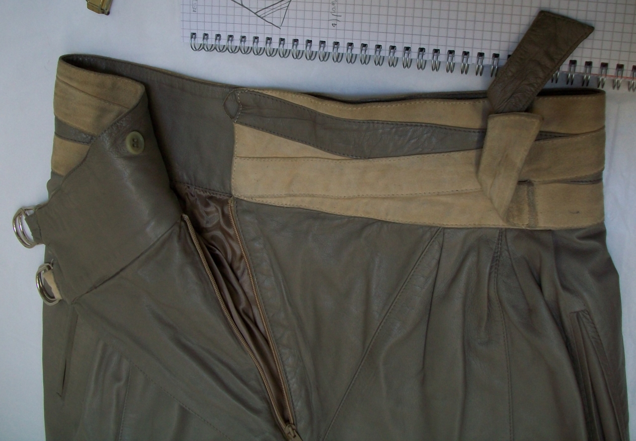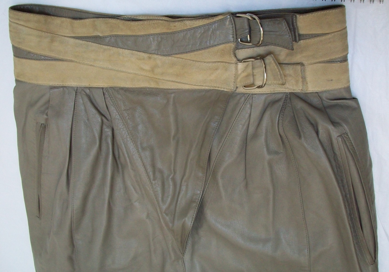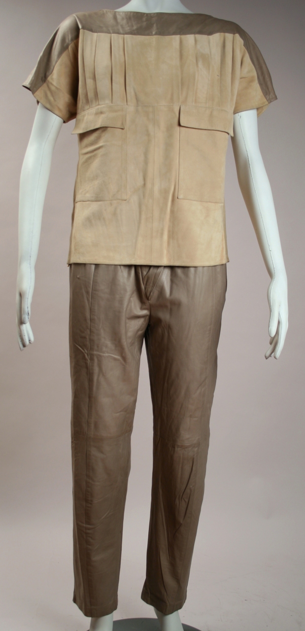 Completo femminile da giorno costituito da casacca e pantaloni. Pantaloni lunghi dal taglio femminile, a vita alta con cinturino decorato da nastri in pelle e camoscio applicati e sovrapposti (in beige chiaro e grigio), chiuso da 2 fibbie metalliche e nastrini in pelle. Pieghe a cannone al giro-vita, anteriormente. Patta anteriore triangolare, fermata da cerniera lampo (posta in posizione diagonale) e bottone forato con rispettiva asola, rifinita a punto cordoncino. Sono presenti 2 tasche a filetto in posizione diagonale sui fianchi, ed altre 2 tasche a filetto orizzontali sul retro. Interamente confezionati in pelle grigia. Fodera di taffetas color marrone, che riveste bacino e parte superiore della braga (fino al ginocchio). Sul centro dietro è presente un'etichetta che ne attesta la provenienza sartoriale