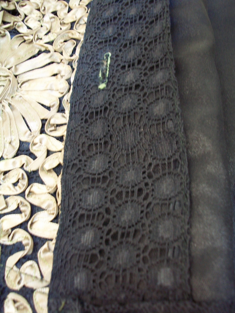Giacchino femminile modello a monopetto, con busto leggermente sagomato e privo di fianchette. Apertura centrale anteriore soprammessa con scollo a V, chiusa da fila di bottoni (4) e rispettivi occhielli rifiniti a macchina. Maniche lunghe al gomito, dal taglio diritto, a pala alta leggermente arricciata. Interamente confezionato in merletto meccanico del tipo Raschel con fili d'effetto, di colore nero, e motivo "ad occhio di pernice" (o a "ragnetti"), ad imitazione delle analoghe lavorazioni a fuselli. Sulla superficie in merletto, lavorazione a ricamo in applicazione realizzata a macchina, impiegando un nastrino di raso verde disposto a formare motivi floreali stilizzati ed effetto "vermicelle" sul fondo. Fodera in taffetas di poliestere misto cotone, di colore nero. Lungo il fianco destro è presente un'etichetta che ne attesta la provenienza sartoriale