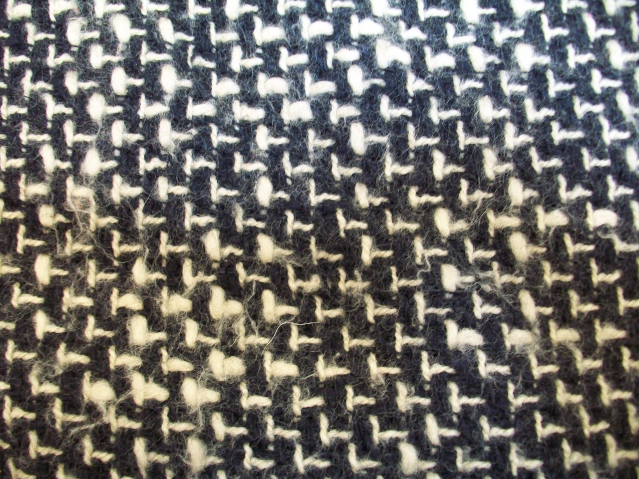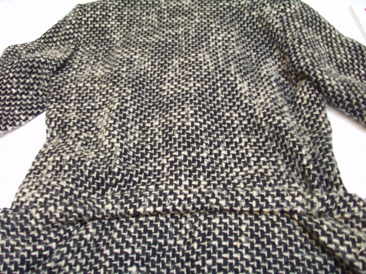 Giaccone corto, di linea sciolta, con maniche lunghe, ampie e dal taglio diritto, con pala alta e imbottiture in corrispondenza delle spalle. Collo sciallato con révers che prolungati verso l'orlo inferiore, vengono risvoltati verso l'esterno, andando a costituire ampie tasche dal profilo arricciato mediante coulisse con nastrino in pelle nera passante attraverso occhielli metallici posti lungo l'orlo (12 per parte). I risvolti, a loro volta, coprono le vere tasche, del tipo applicato, prive di patta e poste sui fianchi. Anche sul retro, l'orlo inferiore del giaccone è stato risvoltato per creare analogo effetto, venendo poi cucito sul centro del dorso, all'altezza del giro-vita, a mo' di martingala. Apertura centrale anteriore accostata, chiusa da bottone in osso e rispettiva asola in pelle nera. All'altezza del punto vita, in corrispondenza delle mostre, sono presenti altri due bottoni analoghi, non funzionali. Interamente confezionato in tessuto di lana ad armatura diagonale (in trama e in ordito si alternano filati di colore bianco e nero); fodera in tessuto diagonale nero, in lana, per il busto, e in taffetas di cupro in tinta per le maniche. Allo scollo, sul centro dietro, sono presenti due etichette che ne attestano la provenienza sartoriale