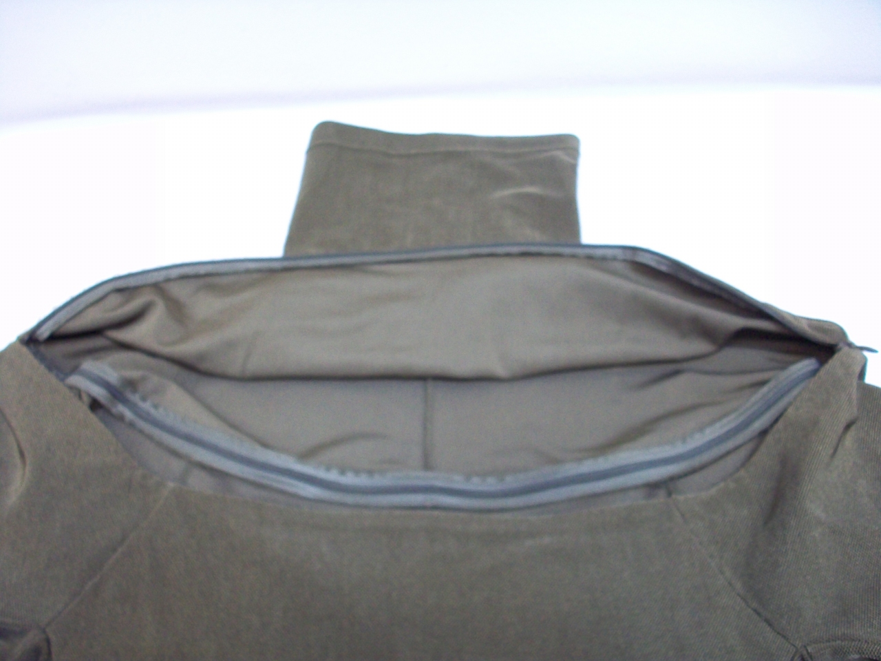 Maglia a vita bassa, di linea aderente (a guaina), con alto collo ad anello e maniche lunghe raglan. Lungo tutto il giro-spalla corre una cerniera lampo che separa sprone e collo dal resto del capo. Interamente confezionata in tessuto jersey sintetico color verde oliva, con effetto a nido d'ape miniaturizzato. Lungo lo scollo, sul centro dietro, sono presenti due etichette che ne attestano l'origine sartoriale