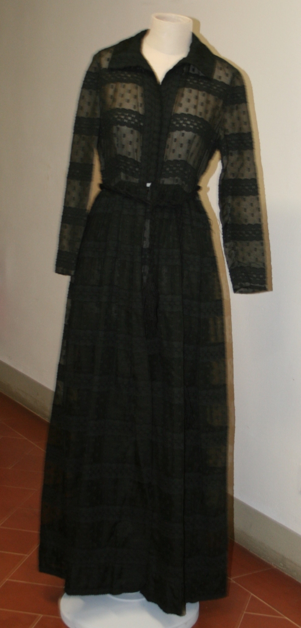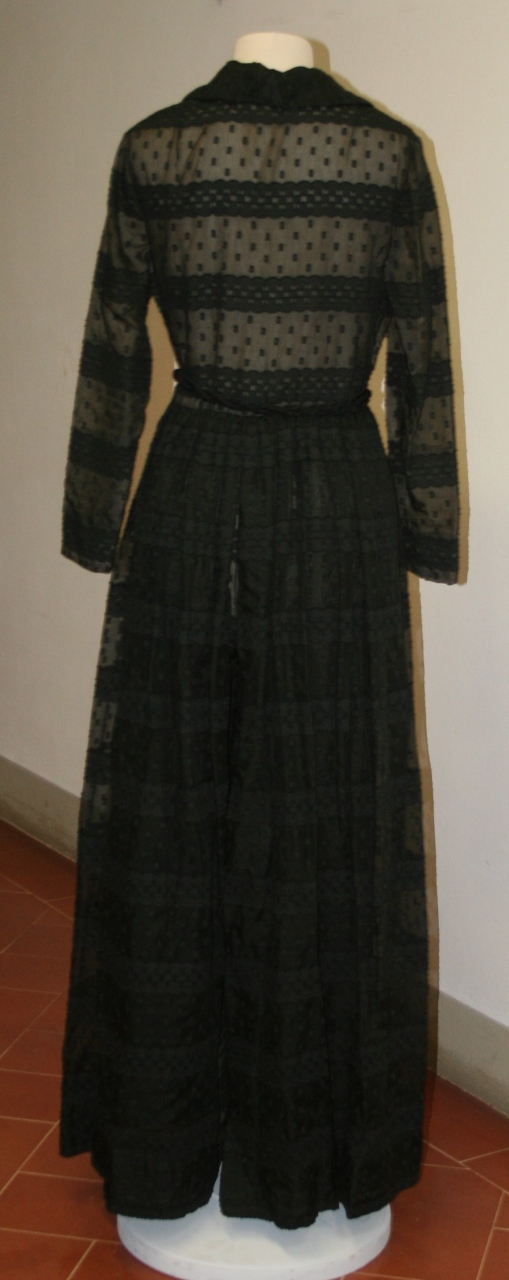 Abito a tuta intera, con corpino e pantaloni lunghi alle caviglie, a gamba diritta. Corpino di linea aderente con maniche lunghe, confezionate in un taglio, e colletto a camicia; presenta apertura centrale anteriore, chiusa al punto vita da tre bottoni automatici; sono presenti pinces sui fianchi (davanti) e sulle scapole (dietro). Lateralmente sono stati fissati dei cordoncini intrecciati per il sostegno della cintura (in cordone da tappezzeria nero, con nappe alle estremità), a mo' di passanti. Il corpino è collegato a un pantalone femminile in 4 tagli, con pinces sui fianchi, privo di tasche e con chiusura centrale anteriore mediante cerniera lampo. Ai pantaloni si sovrappongono due teli della medesima lunghezza, arricciati in vita, che vanno a costituire una gonna ampia con spacchi centrali. Completamente confezionato in chiffon di seta nero operato a una trama lanciata, che crea motivi di nastri orizzontali, dal profilo festonato, alternati a campiture in trasparenza decorate a pois; foderato in garza di seta tinta rosa carne. Internamente, lungo la cucitura del cavallo, è presente un'etichetta che ne attesta la provenienza sartoriale