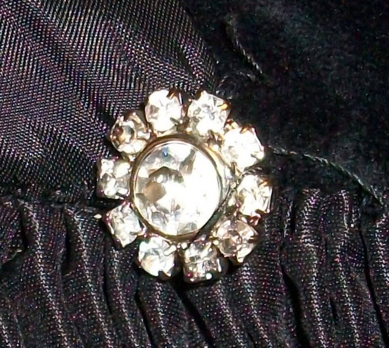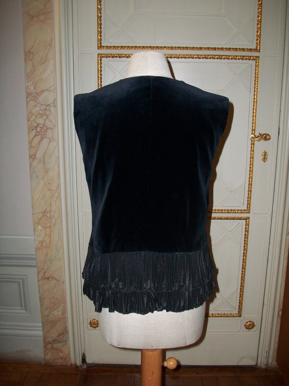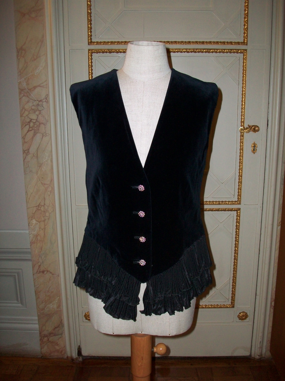 Gilè monopetto femminile da cocktail, confezionato in velluto di seta nero unito. Dotato di scollo a V profondo e apertura centrale anteriore fermata da 4 bottoni-gioiello a forma di fiore, costituiti da strass sfaccettati su montatura in metallo argentato. A ciascuno, corrispondono altrettanti occhielli con orli rifiniti a macchina. Un quinto bottone non funzionale, analogo ai precedenti, è stato fissato all'interno della mostra sinistra, in basso. Faldine anteriori sagomate a punta. Lungo l'orlo inferiore sono applicate gale in taffetas di seta nero, finemente plissettato, disposte su doppio ordine. Interamente foderato in taffetas (fibra sintetica/ artificiale) in tinta. In corrispondenza dello scollo, sul centro dietro, è presente un'etichetta che ne attesta la provenienza sartoriale. Sotto questa, si riscontrano tracce di un'altra etichetta, successivamente recisa