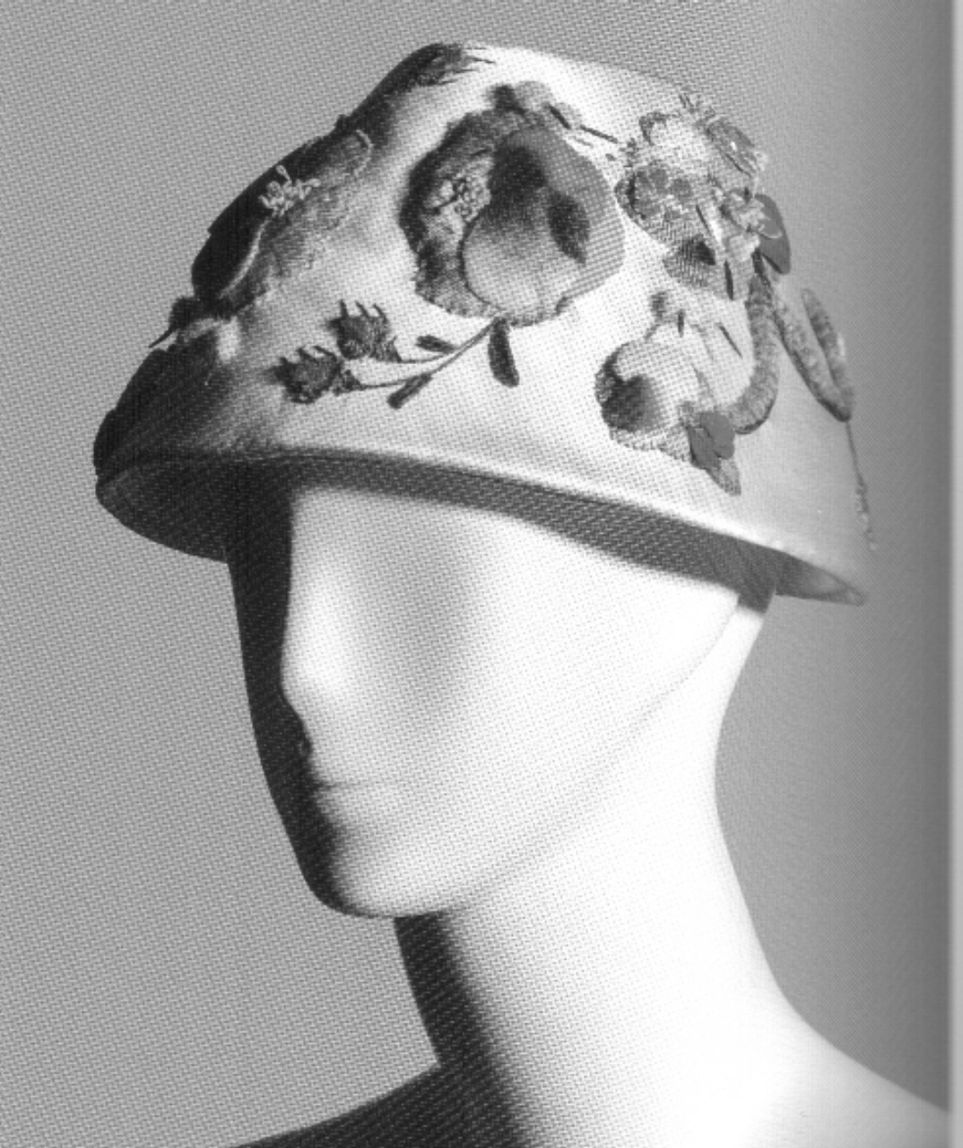 Cappello femminile a zuccotto in raso di seta color avorio con cima sagomata e fascia ornata da fiori imbottiti multicolori. Il decoro è realizzato con frammenti di tessuto in fantasia stampata sui toni del beige, petali sagomati in velluto dipinto nei colori predominanti del violetto, ramoscelli verdi in ciniglia, cellophane e filati di seta, pistilli in diverse forme nei colori del bianco e del giallo. Struttura di sostegno in strati di tessuto, in sparterie con ferrino di profilatura sul bordo. Riscontrata etichetta che ne attesta la manifattura