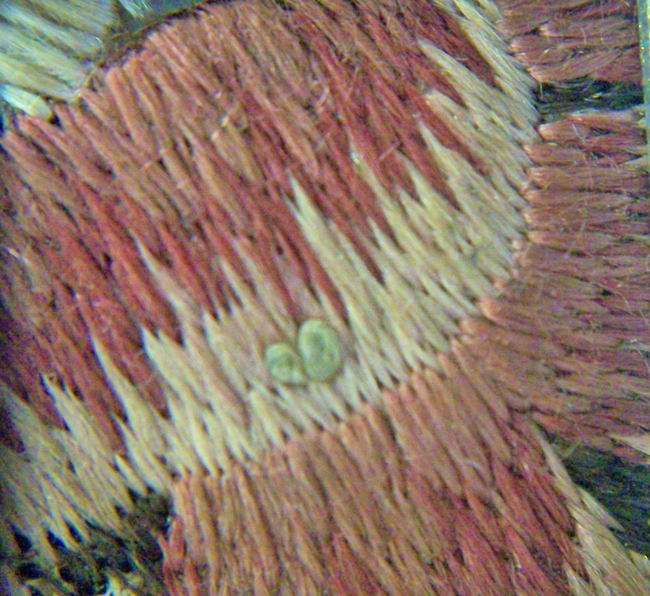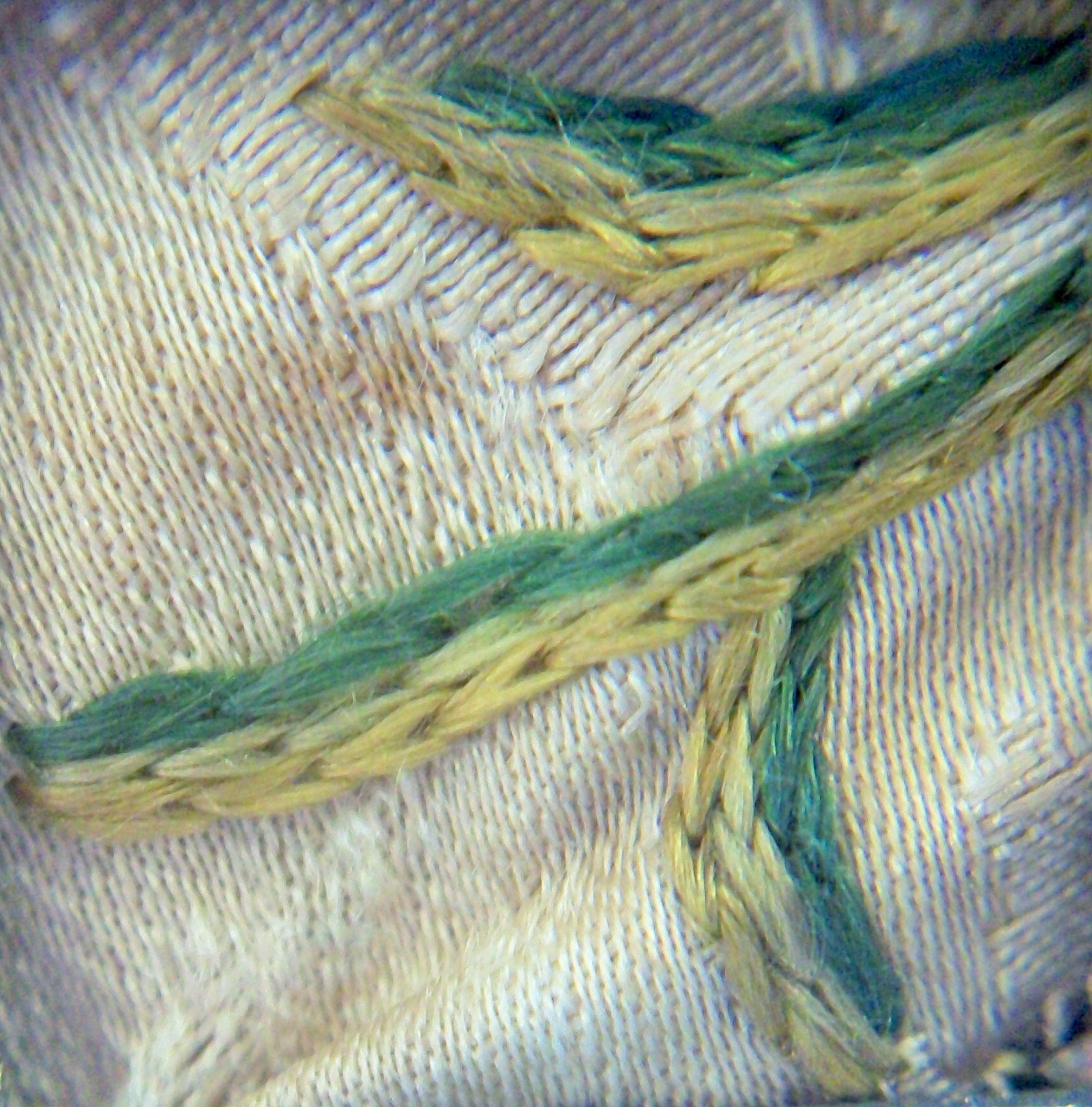 Conopeo di pisside realizzato in tessuto damasco di seta bianco avorio, ricamato a motivi vegetal-floreali in sete policrome (lavorati a punto catenella, nodini francesi, raso e pittura), accompagnati da elementi fitomorfi e "a cartouche" in filati metallici: oro riccio e filato, usati doppi o a torciglione e fissati a punto posato; oro lamellare a punto passato; paillettes tonde dorate con canutiglia argentata a sezione circolare. Riscontrata cimosa: cm 0.6, ad armatura raso, con righe verdi e gialle, e 4 cordelle bianche legate in taffetas all'orlo esterno. Lungo il bordo superiore, nastrini di legatura costituiti da passamaneria a telaio in seta e lino, con motivo di palmette stilizzate. Interamente profilato da bordura a fuselli in argento filato su anima in seta bianca, lavorata a "ventaglietti"
