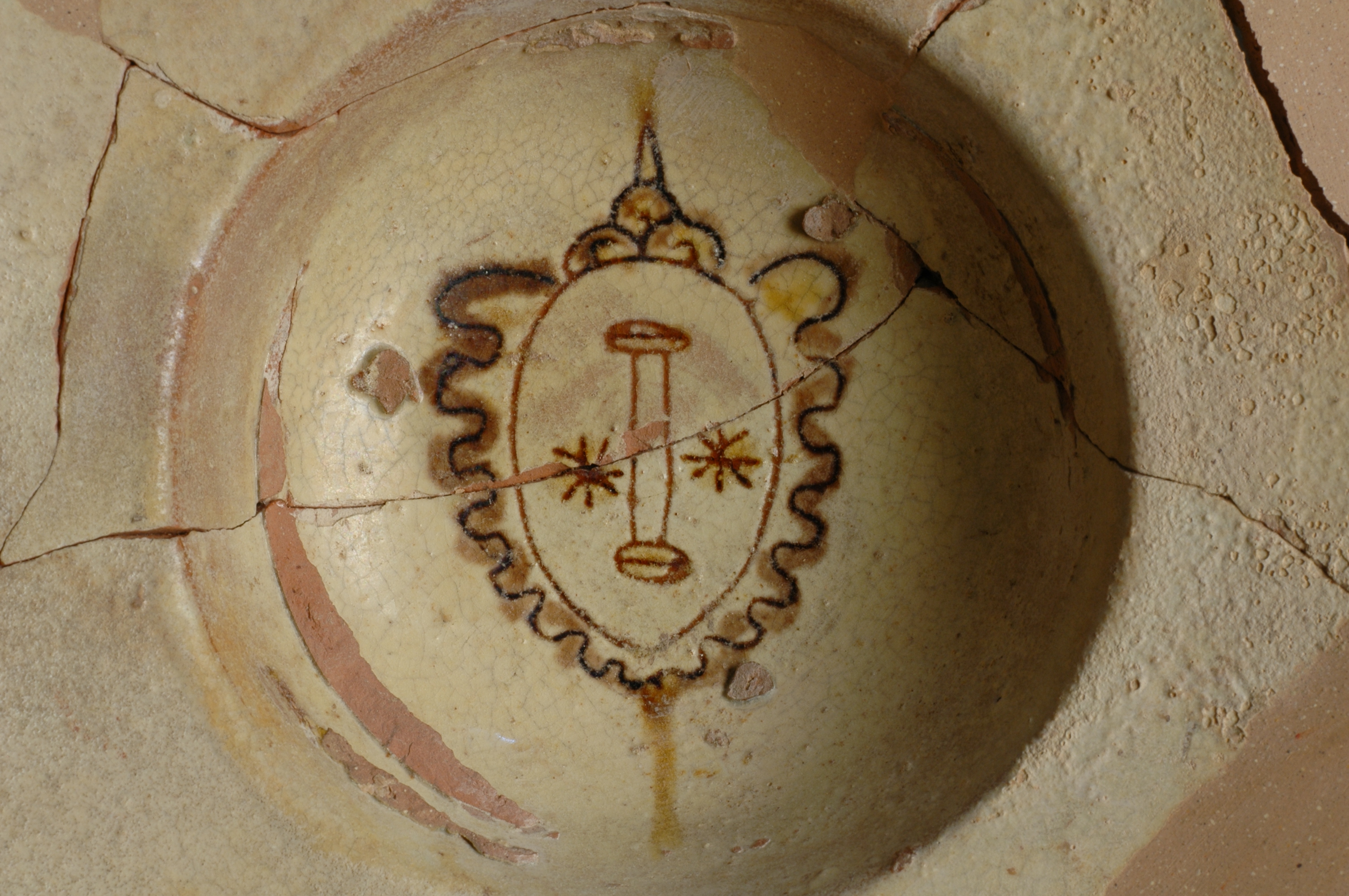 Scodella apoda con fondo appena concavo, cavetto emisferico, larga tesa confluente con bordo arrotolato realizzata in caramica ingobbiata e graffita a punta. L'ingobbio riveste la superficie interna e il bordo nella parte esterna. Sulla superifice interna è presente inoltre della vetrina giallastra. La decorazione, realizzata a punta, è policroma e riporta lo stemma della famiglia Maniscalchi di Volterra su campo non decorato. L'impasto della ceramica è depurato e di colore rosato scuro