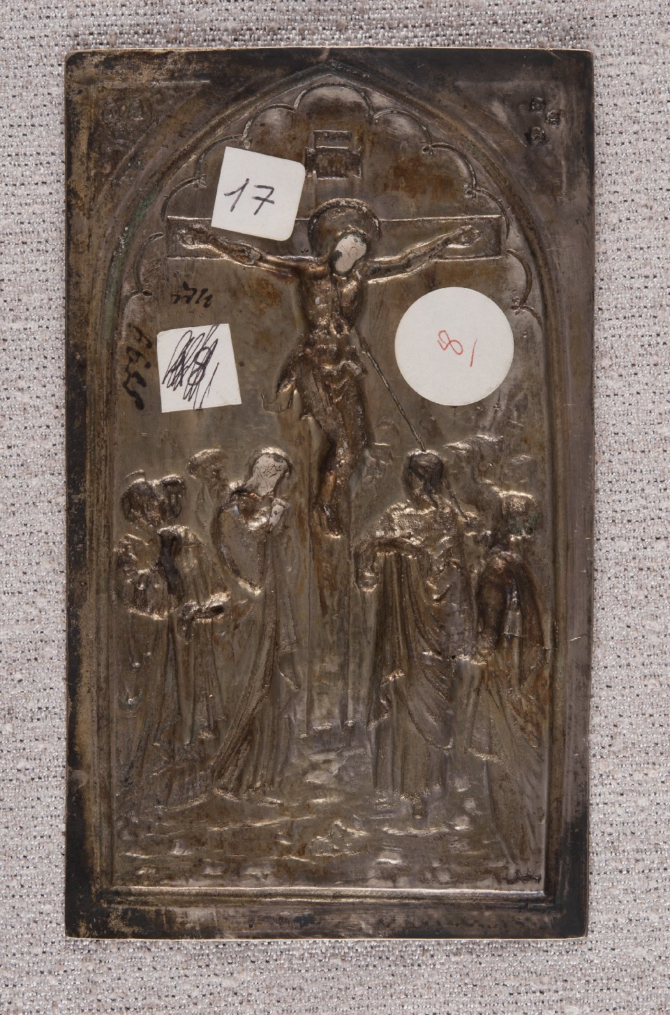 - NOTIZIE STORICO CRITICHE La placchetta della Crocifissione insieme alla placchetta della Deposizione doveva essere stata realizzata per ornare la coperta di un evangelario, probabilmente andavano applicate al centro dei piatti. L'artista che ha scelto una cornice di gusto neogotico per incorniciare la scena, sembra aver rielaborato modelli compositivi ispirati a Rubens