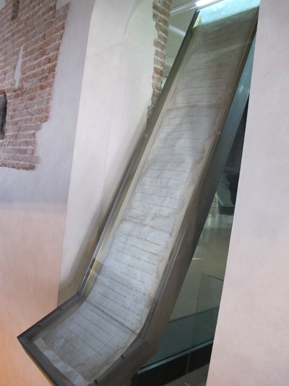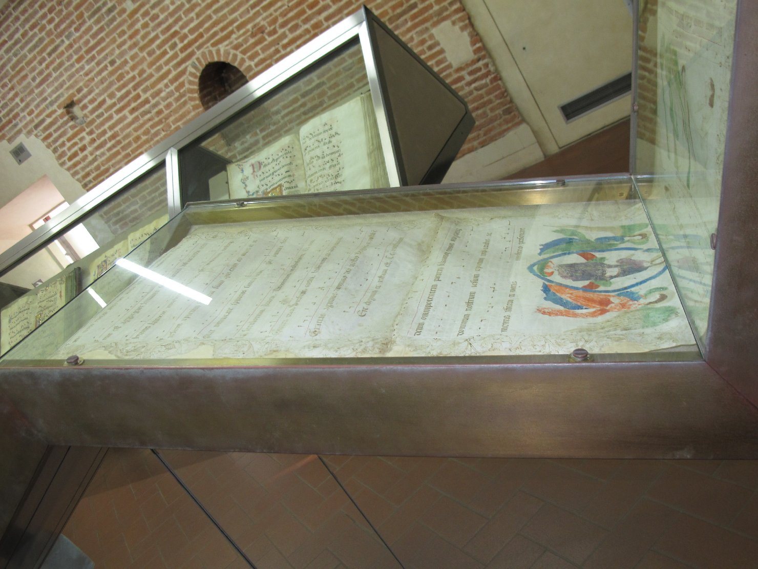- NOTIZIE STORICO CRITICHE L'exultet è un rotolo in pergamena che veniva svoltato dal diacono dall'ambone nei riti del Sabato Santo durante i quali veniva intonato il canto della Resurrezione e nel contempo acceso il cero pasquale. Le raffigurazioni che illustravano il testo erano dipinte in senso contrario rispetto al cantore, che doveva leggere e intonare i canti in modo che potevano essere ben visibili dai fedeli. Generalmente queste proponevano scene dell'Antico e del Nuovo Testamento e i momenti più importanti legati strettamente alla liturgia di Pasqua. Il rotolo qui esaminato dovrebbe essere stato e seguito in ambito pisano intorno alla metà del XIII secolo in quel momento di rinnovo della suppellettile ecclesiastica che interessò il Battistero alla metà del secolo a partire dal fonte battesimale di Guido di Como fino al pulpito di Nicola Pisano. Sicuramente i miniatori locali furono influenzati dalla tradizione della produzione meridionale che era presente nel territorio pisano e lucchese con l'Ordine monastico degli Eremiti Pulsa nesi provenienti da Santa Maria di Pulsano, diocesi di Manfredonia, e che si erano trasferiti in Toscana a partire dalla seconda metà del secolo precedente. Gli studiosi si sono dibattuti a lungo sull'origine meridionale del rotolo o di una sua elaborazione in ambito pisano da parte di un artista in contatto con l'opera del Maestro di San Martino o all'attribuzione, almeno parziale, al Maestro stesso. Il Bertaux (1904) lo ritiene di un m iniatore toscano attivo agli inizi del '300; la Avery (1936) propende invece per l'Italia meridionale; il Muzzioli nel catalogo della Mostra della Miniatura del 1953 lo assegna genericamente all'Italia centrale e al XIII secolo; il Carli (1957, 1974) lo attribuisce a scuola pisana distinguendo due diverse mani nella esecuzione delle miniature attribuendone cinque al Maestro di San Martino; Il Degehnart e la Schmitt (1968) lo riconfermano ad un maestro pisano vicino al Maestro di San Martino datandolo all'ultimo decennio del secolo; la Dalli Regoli (1972, 1986) lo riconduce ad un miniatore diverso dal Maestro di San Martino che ripete a tratti le tipologie caratteristiche degli Exultet meridionali; la Calderoni Masetti (1984 , 1994) infine, lo ascrive ad ambito pisano ed eseguito intorno al 1240-1260 per la committenza di arcivescovi di grande rilievo quali Federico Visconti (1254-1277) o il suo predecessore Vitale (1218-1253). La studiosa, pur riscontrando legami con l'arte meridionale, individua nelle "slanciate figure avvolte in ampi mantelli dal panneggio fitto e pluridirezionale, per le masse cromatiche incise da strigliature luminose, per i bianchi volti appena caratterizzati nei lineamenti da sottili linee di inchiostro e da lievi ombreggiature all'acquerello" (1984, p. 216) anche un influenza europea derivante sia dall'arte dei maestri vetrai francesi e tedeschi attivi ad Assisi nelle vetrate della Basilica Superiore, sia dall'arte orafa dei maestri limosini le cui opere sono documentate nel territorio pisano fino dall'ultimo venticinquennio del XIII secolo. Lo stesso motivo a racemi e volute che incornici a tutto il rotolo deriva chiaramente dalla tradizione orafa. La studiosa riconosce comunque la presenza di due mani nella stesura del ciclo figurativo, ciclo che veniva illustrato prima della parte grafica e vede nello scriba l'autore del fregio che delimita il testo su tutti i lati. Il programma iconografico dell'Exultet è particolarmente selettivo e privilegia le i mmagini cristologiche e quelle relative alle funzioni del Sabato Santo, non concedendo spazio a temi naturalistici presenti invece in quasi tutti i rotoli conosciuti. Il rotolo è composto da otto parti incollate fra loro. La prima sezione fu sostituita, probabilm ente nell'ultimo ventennio del XIX secolo, con una copia su pergamena moderna. L'originale fu però fortunatamente conservato e rincollato al suo posto durante il restauro della fine degli anni Ottanta