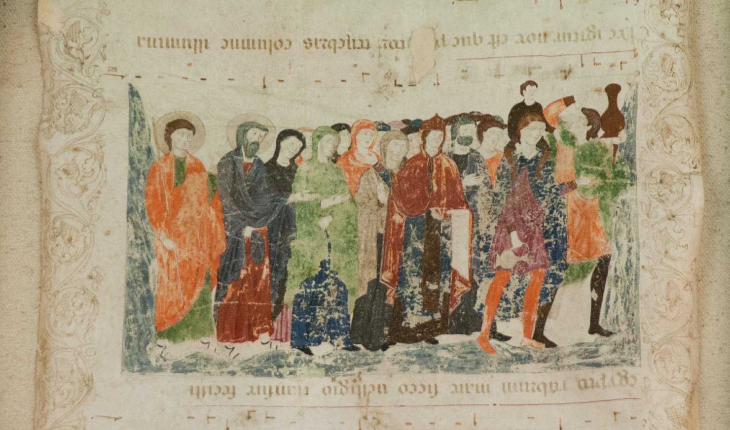 - NOTIZIE STORICO CRITICHE canto della Resurrezione e nel contempo acceso il cero pasquale. Le raffigurazioni che illustravano il testo erano dipinte in senso contrario rispetto al cantore, che doveva leggere e intonare i canti in modo che potevano essere ben visibili dai fedeli. Generalmente queste proponevano scene dell'Antico e del Nuovo Testamento e i momenti più importanti legati strettamente alla liturgia di Pasqua. Il rotolo qui esaminato dovrebbe essere stato e seguito in ambito pisano intorno alla metà del XIII secolo in quel momento di rinnovo della suppellettile ecclesiastica che interessò il Battistero alla metà del secolo a partire dal fonte battesimale di Guido di Como fino al pulpito di Nicola Pisano. Sicuramente i miniatori locali furono influenzati dalla tradizione della produzione meridionale che era presente nel territorio pisano e lucchese con l'Ordine monastico degli Eremiti Pulsa nesi provenienti da Santa Maria di Pulsano, diocesi di Manfredonia, e che si erano trasferiti in Toscana a partire dalla seconda metà del secolo precedente. Gli studiosi si sono dibattuti a lungo sull'origine meridionale del rotolo o di una sua elaborazione in ambito pisano da parte di un artista in contatto con l'opera del Maestro di San Martino o all'attribuzione, almeno parziale, al Maestro stesso. Il Bertaux (1904) lo ritiene di un m iniatore toscano attivo agli inizi del '300; la Avery (1936) propende invece per l'Italia meridionale; il Muzzioli nel catalogo della Mostra della Miniatura del 1953 lo assegna genericamente all'Italia centrale e al XIII secolo; il Carli (1957, 1974) lo attribuisce a scuola pisana distinguendo due diverse mani nella esecuzione delle miniature attribuendone cinque al Maestro di San Martino; Il Degehnart e la Schmitt (1968) lo riconfermano ad un maestro pisano vicino al Maestro di San Martino datandolo all'ultimo decennio del secolo; la Dalli Regoli (1972, 1986) lo riconduce ad un miniatore diverso dal Maestro di San Martino che ripete a tratti le tipologie caratteristiche degli Exultet meridionali; la Calderoni Masetti (1984 , 1994) infine, lo ascrive ad ambito pisano ed eseguito intorno al 1240-1260 per la committenza di arcivescovi di grande rilievo quali Federico Visconti (1254-1277) o il suo predecessore Vitale (1218-1253). La studiosa, pur riscontrando legami con l'arte meridionale, individua nelle "slanciate figure avvolte in ampi mantelli dal panneggio fitto e pluridirezionale, per le masse cromatiche incise da strigliature luminose, per i bianchi volti appena caratterizzati nei lineamenti da sottili linee di inchiostro e da lievi ombreggiature all'acquerello" (1984, p. 216) anche un influenza europea derivante sia dall'arte dei maestri vetrai francesi e tedeschi attivi ad Assisi nelle vetrate della Basilica Superiore, sia dall'arte orafa dei maestri limosini le cui opere sono documentate nel territorio pisano fino dall'ultimo venticinquennio del XIII secolo. Lo stesso motivo a racemi e volute che incornici a tutto il rotolo deriva chiaramente dalla tradizione orafa. La studiosa riconosce comunque la presenza di due mani nella stesura del ciclo figurativo, ciclo che veniva illustrato prima della parte grafica e vede nello scriba l'autore del fregio che delimita il testo su tutti i lati. Il programma iconografico dell'Exultet è particolarmente selettivo e privilegia le i mmagini cristologiche e quelle relative alle funzioni del Sabato Santo, non concedendo spazio a temi naturalistici presenti invece in quasi tutti i rotoli conosciuti. Il rotolo è composto da otto parti incollate fra loro. La prima sezione fu sostituita, probabilm ente nell'ultimo ventennio del XIX secolo, con una copia su pergamena moderna. L'originale fu però fortunatamente conservato e rincollato al suo posto durante il restauro della fine degli anni Ottanta