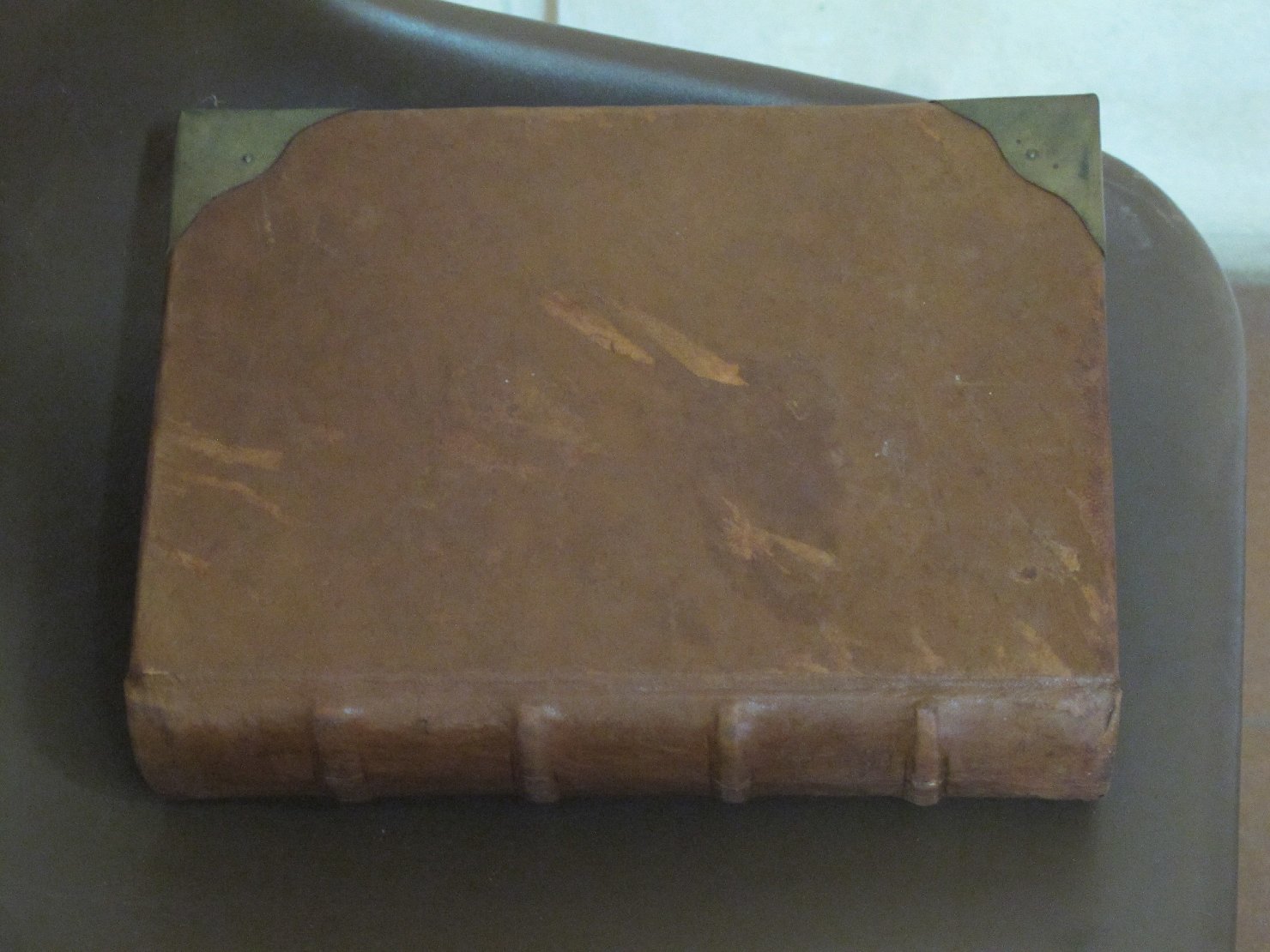 Piatti in legno ricoperti di cuoio con angolatura in ottone. Quattro nervature nel dorso