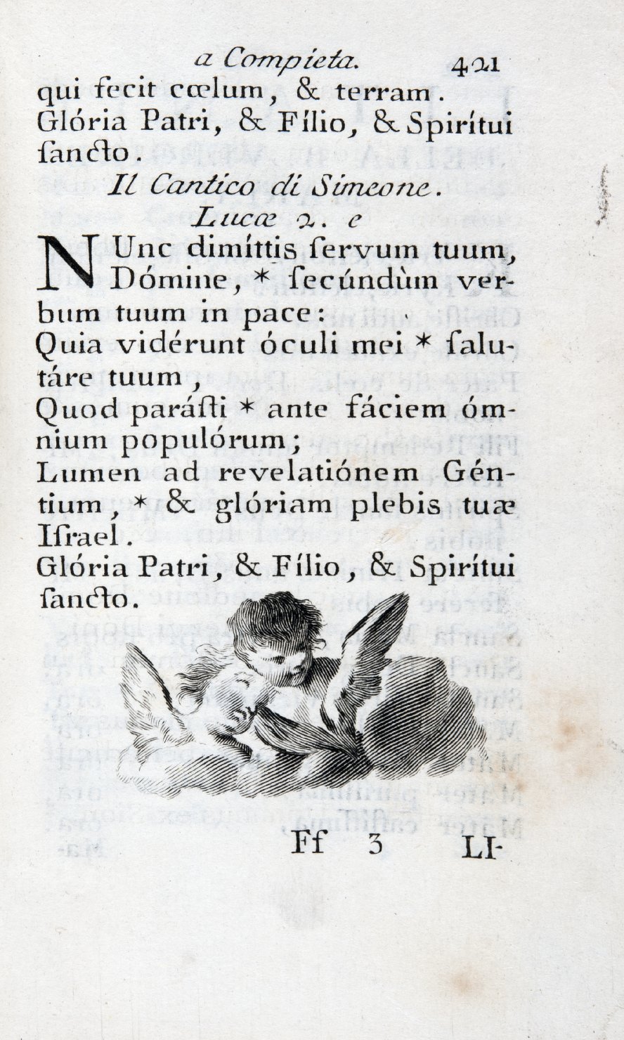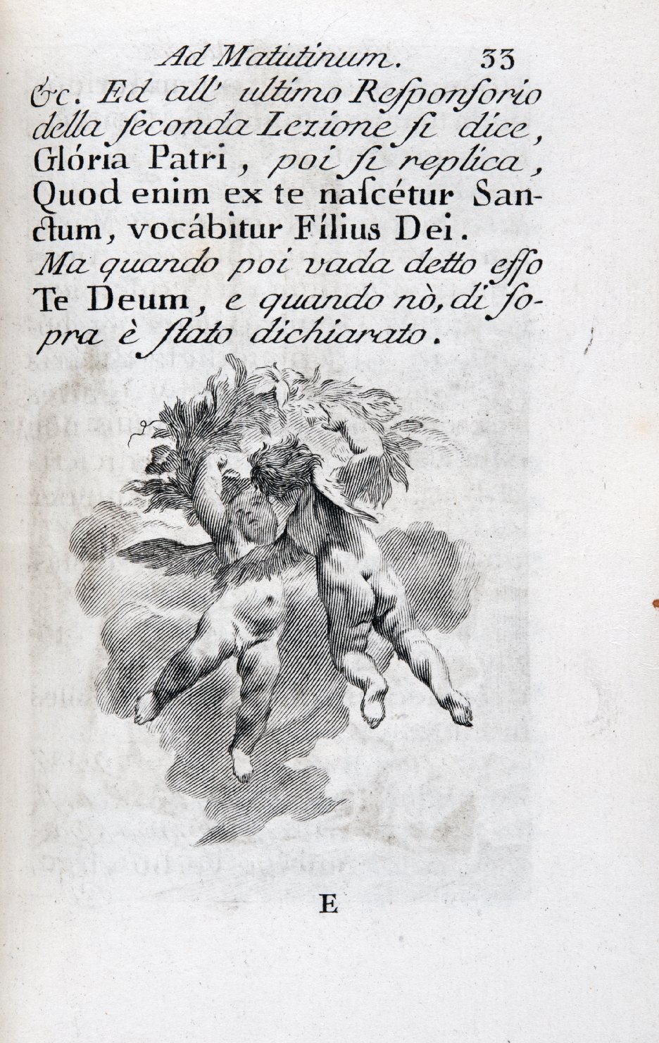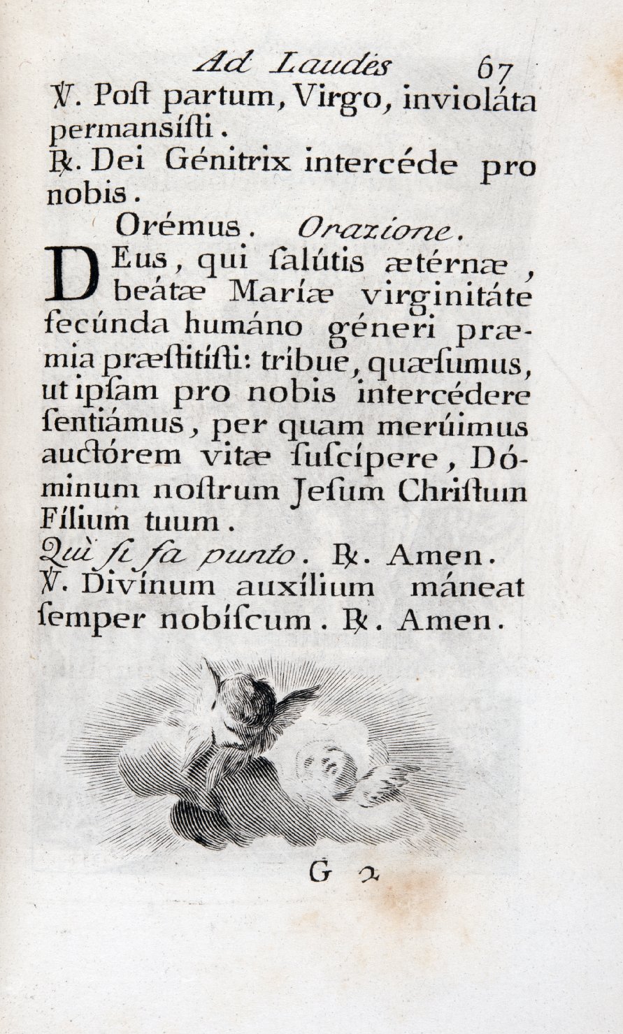- NOTIZIE STORICO CRITICHE Il libretto fa parte di una donazione di opere d'arte fatta dalla signora Giuseppina Boni in memoria del marito Mino Rosi e del figlio Giovanni. La donazione all'Opera della Primaziale fu eseguita nel 1996 con la clausola che le opere fossero esposte nel museo. Le opere d'arte furono acquistate da Mino Rosi presso case d'aste fiorentine fra gli anni 1940-1960. Il libretto fu stampato nel 1740 dall'editore Giovan Battista Pasquali a spese del negoziante veneziano Caime "in segno di divota gratitudine verso la Regina Celeste alla qual di tanti benefici si confessa debitore" (Morazzoni, 1943). Il prezioso libricino è il risultato di una stretta e felice collaborazione fra il pittore Giovan Battista Piazzetta che eseguì i 37 disegni (tavole a piena pagina, finali e vignette) del libretto e l'incisore Marco Pitteri che riuscì ad interpretare pienamente la sensibilità psicologica di uno dei pittori più religiosi della pittura veneziana del Settecento. Il Piazzetta nei disegni condensa in pochi tratti tutta la sua visione chiaroscurale in cui le parti in luce sono lasciate quasi completamente libere da segni in un gioco di ombre e luminosità che poi il Pitteri riuscirà a tradurre nelle incisioni con tratti "energici e arditi condotti parallelamente secondo la maniera del Mellan" (Ravà, 1921). I disegni preparatori del Piazzetta sono oggi conservati presso la Fondazione Kress di New York (Pallucchini, 1946). Il testo fu inciso lettera per lettera da Angela Baroni. La raccolta dei rami del libretto passò in seguito,1759, all editore Giuseppe Remondini di Bassano che ne eseguì per lo meno altre sei edizioni di cui tre in spagnolo (Casini, 1998)