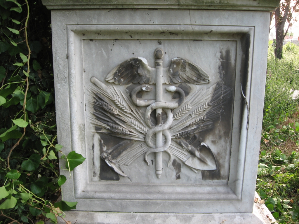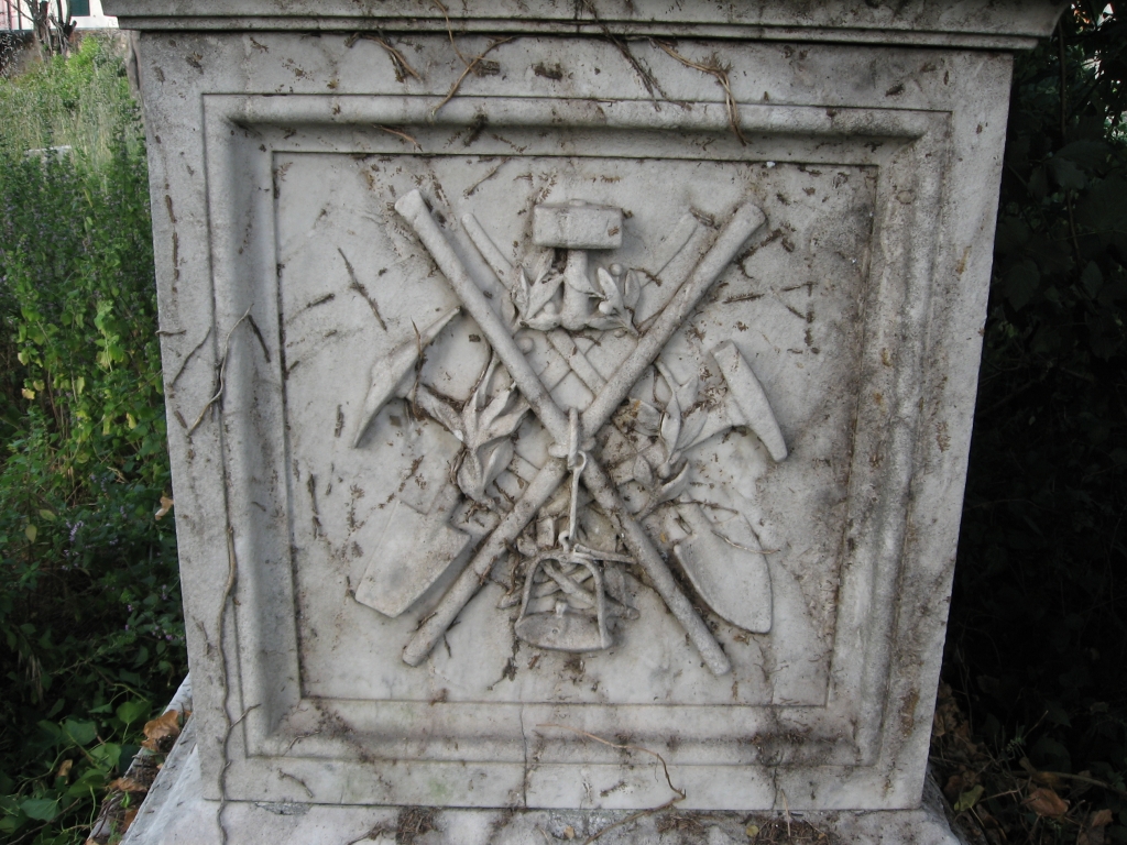 Su zoccolo su gradino poggia grande parallelepipedo a base rettangolare co n cornice di foglie d'acanto alla base, con iscrizioni sulla specchiatura anteriore e posteriore; bassorilievi su specchi laterali: a sinistra uno s cettro alato tra due serpenti e spighe di grano, incrociati da una pala e una piccozza; a destra due bastoni incrociati circondati da una corona di ulivo e da attrezzi da lavoro (martelli, pale, piccone e lanterna). Sul pa rallelepipedo un grande sarcofago con zampe di leone, con cornice di fogli e d'acanto alla base e foglie lanceolate sul bordo del coperchio