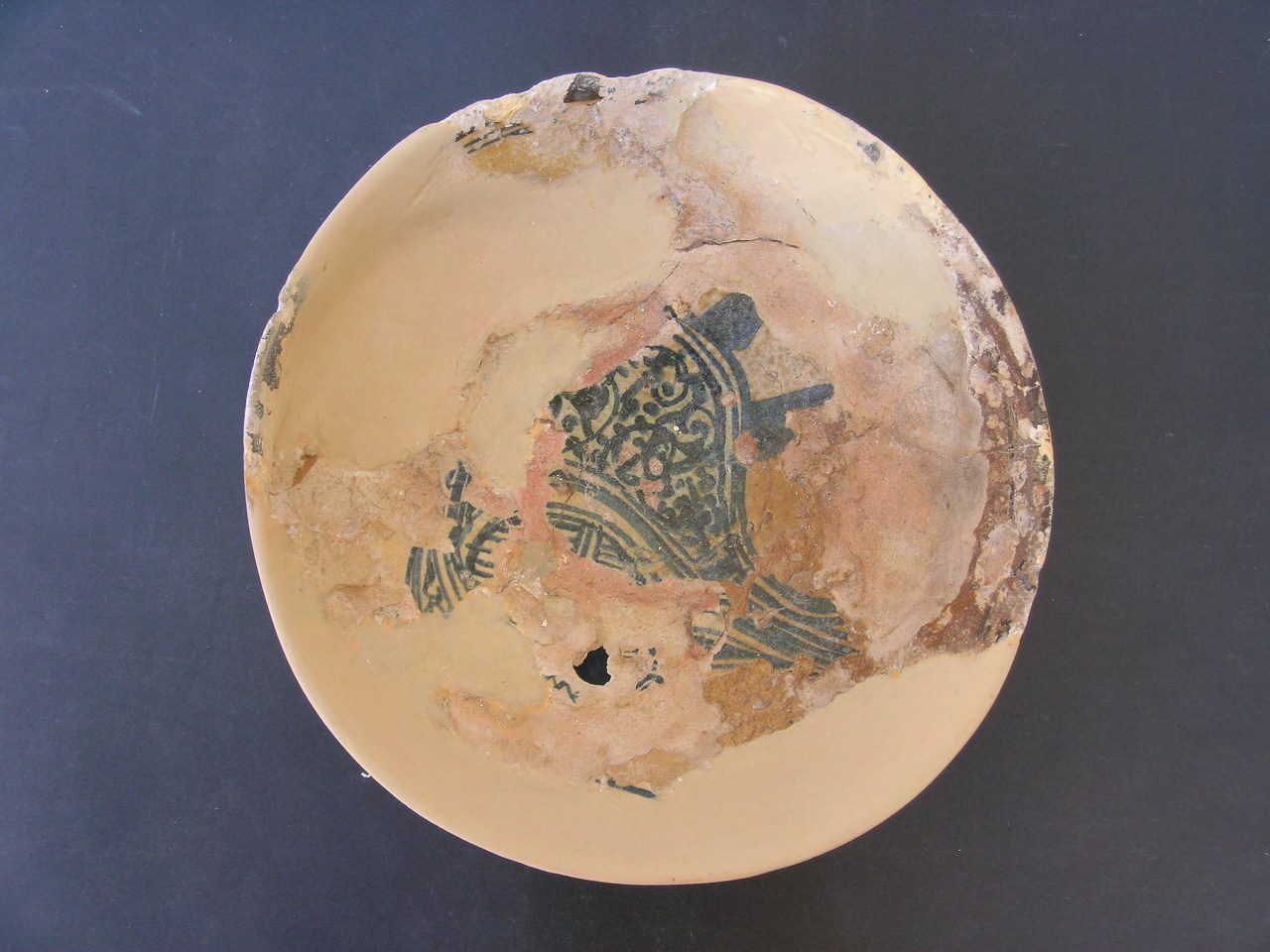 Bacino privo di tesa con piede ad anello ed un foro di sospensione nell’anello, eseguito a crudo. Rivestimento interno con smalto e decoro in cobalto e manganese, nudo esterno