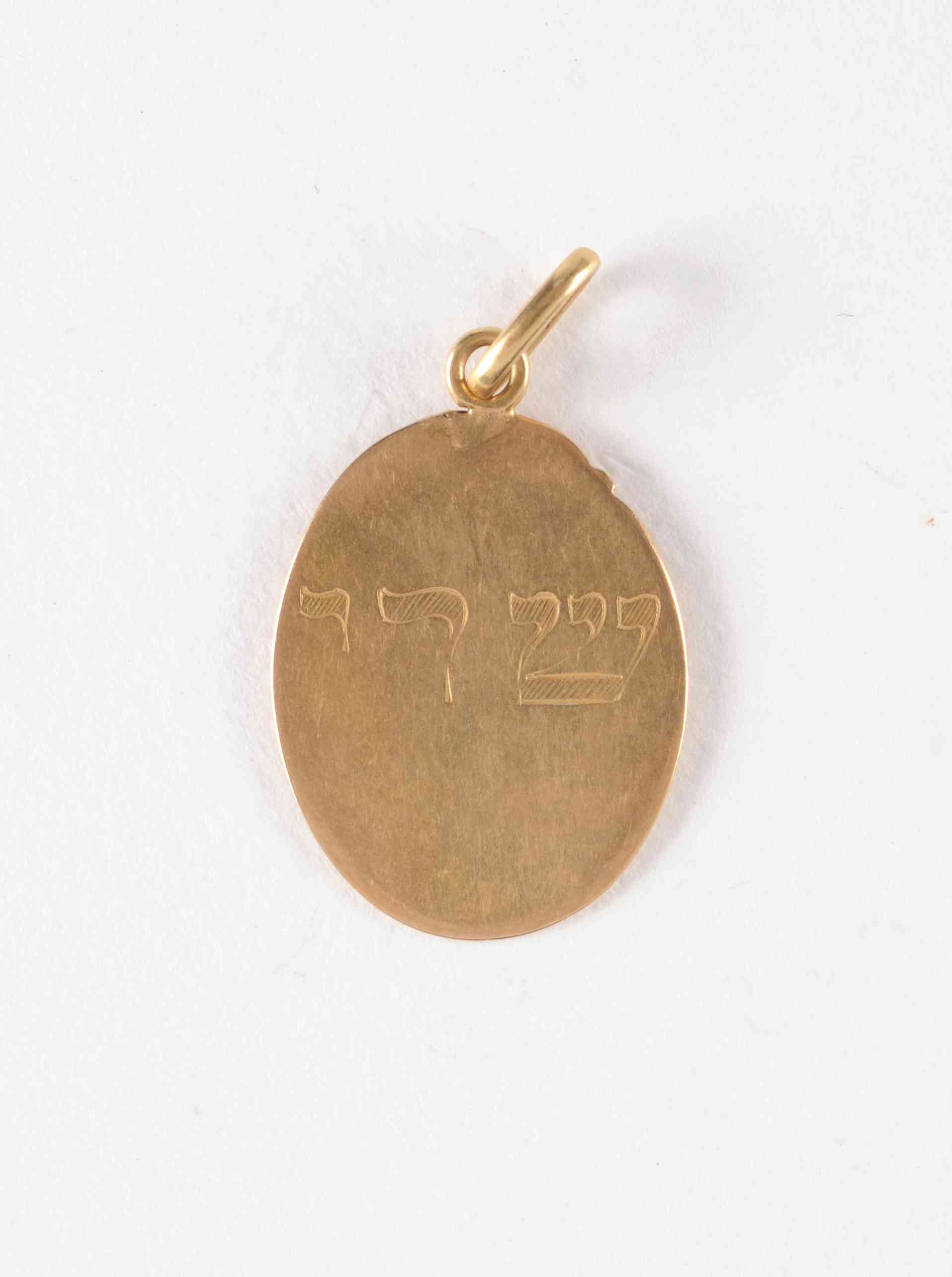 Shaddai in oro giallo a forma di medaglia ovale con gancio per catena; su un lato è presente un' iniziale ed un tralcio fiorito in rilievo, sull'altro un' iscrizione incisa