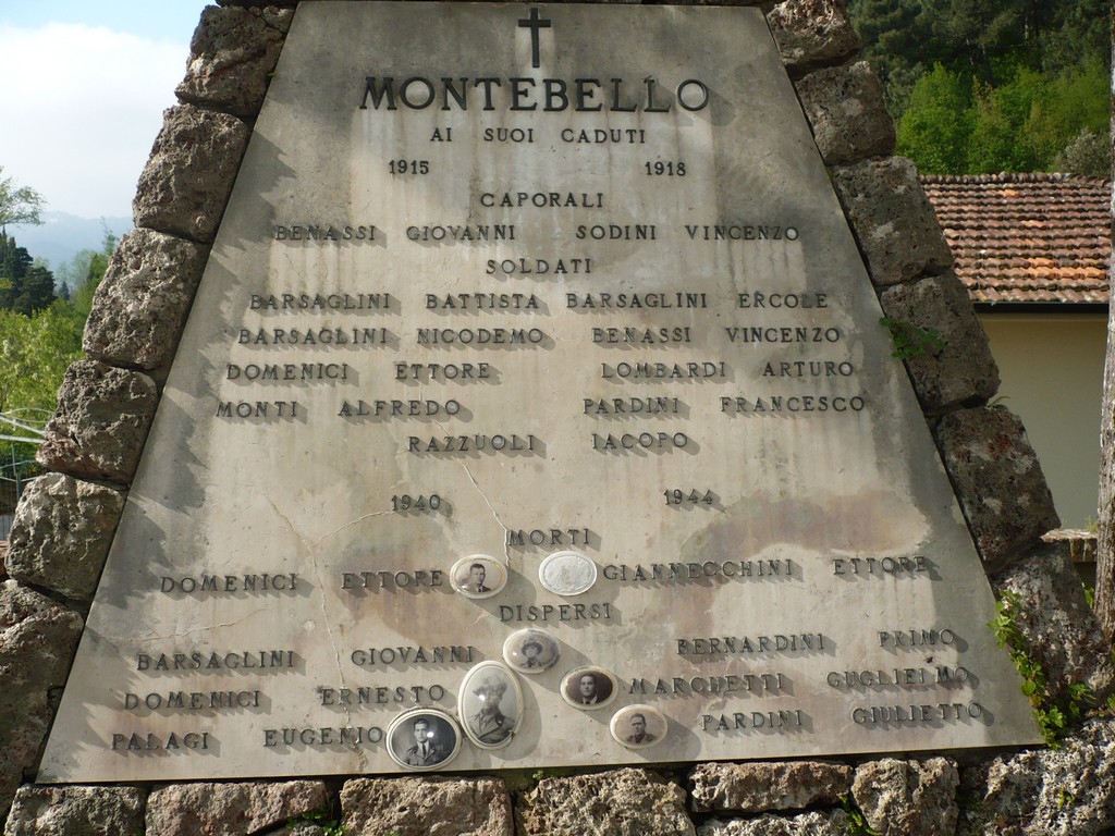 - ISCRIZIONI basamento - MONTEBELLO/ AI SUOI CADUTI/ 1915 - 1918/ CAPORALI/ BENASSI GIOVANNI SODINI VINCENZO/ SOLDATI/ BARSAGLINI BATTISTA/ BARSAGLINI ERCOLE/ BARSAGLINI NICODEMO/ BENASSI VINCENZO/ DOMENICI ETTORE/ LOMBARDI ARTURO/ MONTI ALFREDO/ PARDINI FRANCESCO/ RAZZUOLI IACOPO/ 1940 - 1944/ [SEGUONO NOMI] - capitale - a caratteri applicati in bronzo - italiano