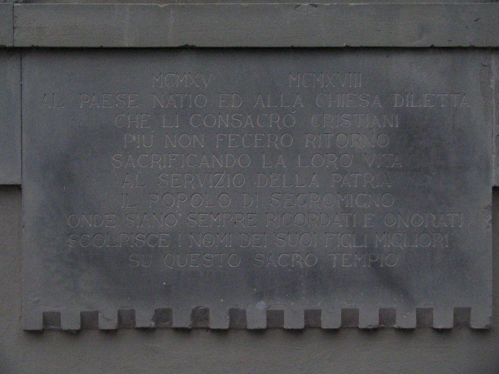 - ISCRIZIONI lapide in basso - MILITARI/ MORTI IN GUERRA/ GHITI UGO DI ELISEO/ SODINI LUIGI DI RICCARDO/ ALESSANDRI MARIO DI ANNIBALE/ GRANUCCI GUIDO DI TEODORO/ BECHELLI GIUSEPPE DI DOMENICO/ PAPERA ATTILIO DI ANSANO/ DEL FRATE LUIGI DI VINCENZO/ MICHELINI POMPILIO DI GIUSEPPE/ UBALDINI CONTE ALFREDO/ CESARI GIOVANNI DI GIUSEPPE/ GIANNINI ABRAMO DI GIUSEPPE/ PERA PIETRO DI LUIGI/ PUCCI ANTONIO DI GIOVANNI/ SERAFINI DIEGO/ D'OLIVO ALADINO DI LUIGI/ BIAGINI CARLO DI PASQUALE/ PERA RINALDO DI GIUSEPPE/ GIANNINI VITTORIO DI VITTORIO/ ROSI GIOVANNI DI CAMILLO/ CELESTINI FRANCESCO DI CELESTINO/ LENCIONI LUIGI DI GIOVANNI/ GRADI LORENZO DI IACOPO/ SANTORI LORENZO DI EMILIO/ DI NARDO DANTE DI SIRO/ ALESSANDRI GUIDO DI PIETRO/ BIANCHI PIETRO DI TOMMASO/ MICHELINI ENRICO DI GIUSEPPE/ LITTERI ENRICO DI GIOVANNI/ ROSI DANTE DI EUGENIO/ FENILI GIOVANNI DI EMILIO/ DINELLI DON IACOPO DI ANDREA/ CIUCCI ALBERTO DI GAUDENZIO/ LENCI ALBERTO DI GIUSEPPE/ DISPERSI/ BARTOLETTI EUGENIO DI FRANCESCO/ D'AGNELLO VITTORIO DI AMERIGO; MCMXV MCMXVIII/ AL PAESE NATIO ED ALLA CHIESA DILETTA/ CHE LI CONSACRO' CRISTIANI/ PIU' NON FECERO RITORNO/ SACRIFICANDO LA LORO VITA/ AL SERVIZIO DELLA PATRIA/ IL POPOLO DI SEGROMIGNO/ ONDE SIANO SEMPRE RICORDATI E ONORATI/ SCOLPISCE I NOME DEI SUOI FIGLI MIGLIORI/ SU QUESTO SACRO TEMPIO - capitale -