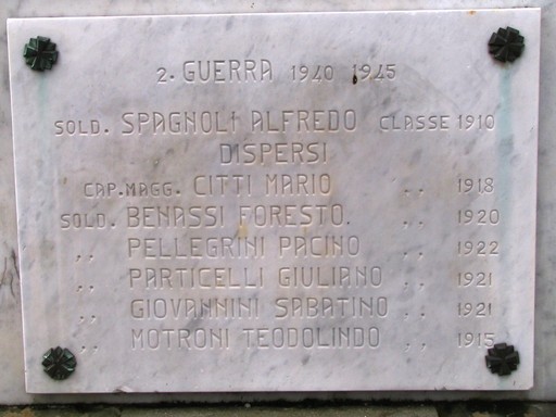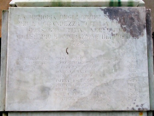 - ISCRIZIONI obelisco - LA MEMORIA DEGLI EROICI SUOI FIGLI/ PER LA GRANDEZZA D'ITALIA IMMOLATI/ CORSAGNA ETERNA NEL MARMO/ AD ESEMPIO ED AMMIRAZIONE DEI POSTERI/ 1922/ PAPERA PIETRO/ PAPERA INOCENZO/ ALBERIGI GIUSEPPE/ DINUCCI AMINTA/ GIUSTI RAFFAELLO/ PAPERA LORENZO/ PIERONI FRANCESCO/ PIERONI PIETRO/ POLI ANTONIO/ PARTICELLI PIO; TRENTO E TRIESTE 3 NOVEMBRE 1918; 2. GUERRA 1940 1945/ [segue nome]/ DISPERSI/ [seguono nomi] - capitale - a incisione - italiano