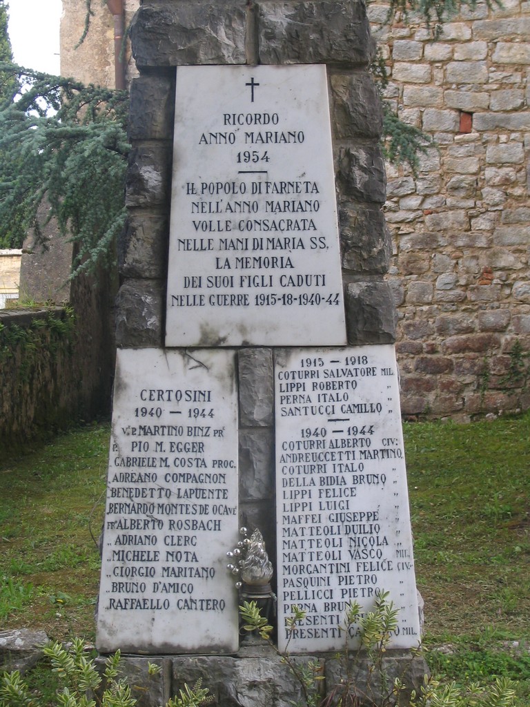 - NOTIZIE STORICO CRITICHE Il monumento fu eretto nel corso degli anni Venti del Novecento in ricordo dei caduti della frazione di Farneta nella Grande Guerra. Nel 1954 su di esso furono aggiunte le lapidi in memoria dei soldati, civili e certosini morti nel secondo conflitto mondiale e nella strage di Farneta