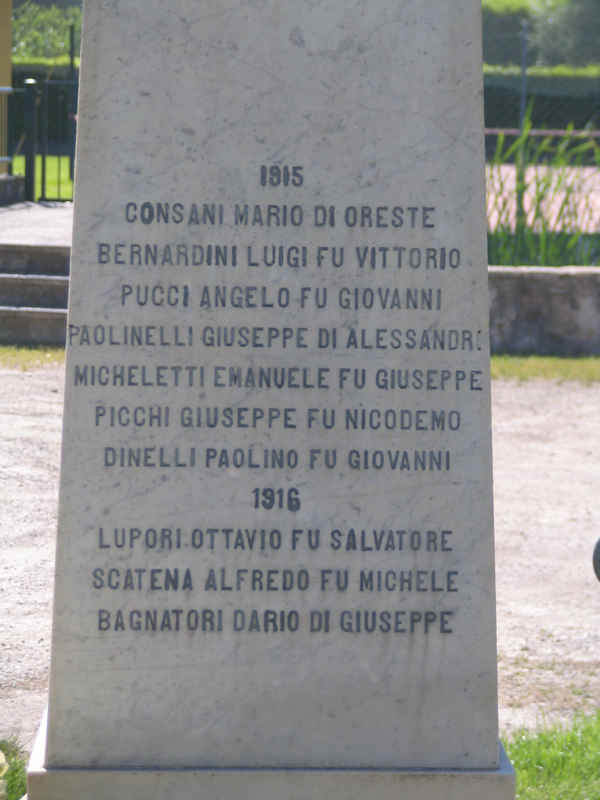 - NOTIZIE STORICO CRITICHE Istituito nel 1919 un comitato pro monumento, i lavori per la realizzazione dell'opera si svilupparono in tempi brevi su un'area di proprietà delle ferrovie dello stato. Attorno all’area di rispetto esisteva un piccolo parco di lecci ciascuno dei quali inserito in una propria aiuola circolare di cui rimane qualche traccia. I caduti menzionati nell'Albo dei Caduti della Grande Guerra (http://www.cadutigrandeguerra.it/) sono: Consani Mario di Oreste, Bernardini Luigi fu Vittorio, Micheletti Emanuele fu Giuseppe, Picchi Giuseppe fu Nicodemo, Dinelli Paolino fu Giovanni, Lupori Ottavio fu Salvatore, Bagnatori Dario di Giuseppe, Pucci Nello di Attilio, Carignani Vittorio di Lorenzo, Vannini Giuseppe di Antonio, Pardini Gaudenzio di Alfredo, Torra Giovanni di Eugenio, Andreuccetti Giuseppe fu G.Battista, Dinelli Niccola di Ignazio, Quilici Demetrio fu Daniele, Carignani Alberto di Stefano, Dinelli Leone fu Silvio, Angeli Italo di Giuseppe. Bib.: Delibera n. 1023 della Giunta Municipale di Lucca del 21 maggio 1919; Archivio Storico del Comune di Lucca (ASCL), Lettera al Podestà di Lucca del 18 gennaio 1929, Protocollo generale, categoria 1, 10, 3 "monumenti e lapidi commemorative", anno 1928; Archivio Storico del Comune di Lucca (ASCL), Lettera della sezione locale del PNF di Ponte a Moriano al Podestà di Lucca del 22 gennaio 1929, Protocollo generale, categoria 1, 10, 3 "monumenti e lapidi commemorative", anno 1928. Per i lavori necessari alla sistemazione dell'area in cui doveva sorgere il monumento si veda la Delibera n. 1318 della Giunta Municipale di Lucca del 23 giugno 1919