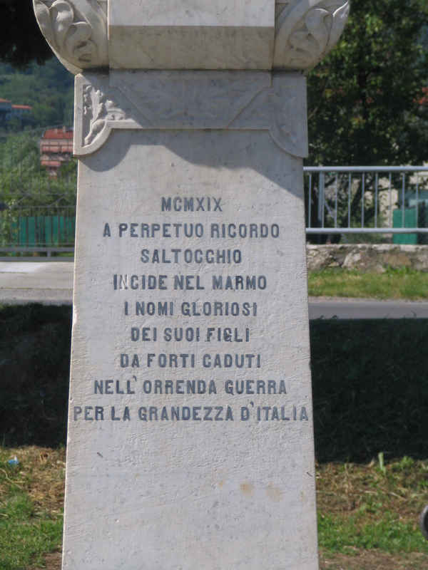 - ISCRIZIONI al centro della facciata frontale del corpo centrale - MCMXIX/ A PERPETUO RICORDO/ SALTOCCHIO/ INCIDE NEL MARMO/ I NOMI GLORIOSI/ DEI SUOI FIGLI/ DA FORTI CADUTI/ NELL'ORRENDA GUERRA/ PER LA GRANDEZZA D'ITALIA - capitale - a incisione -