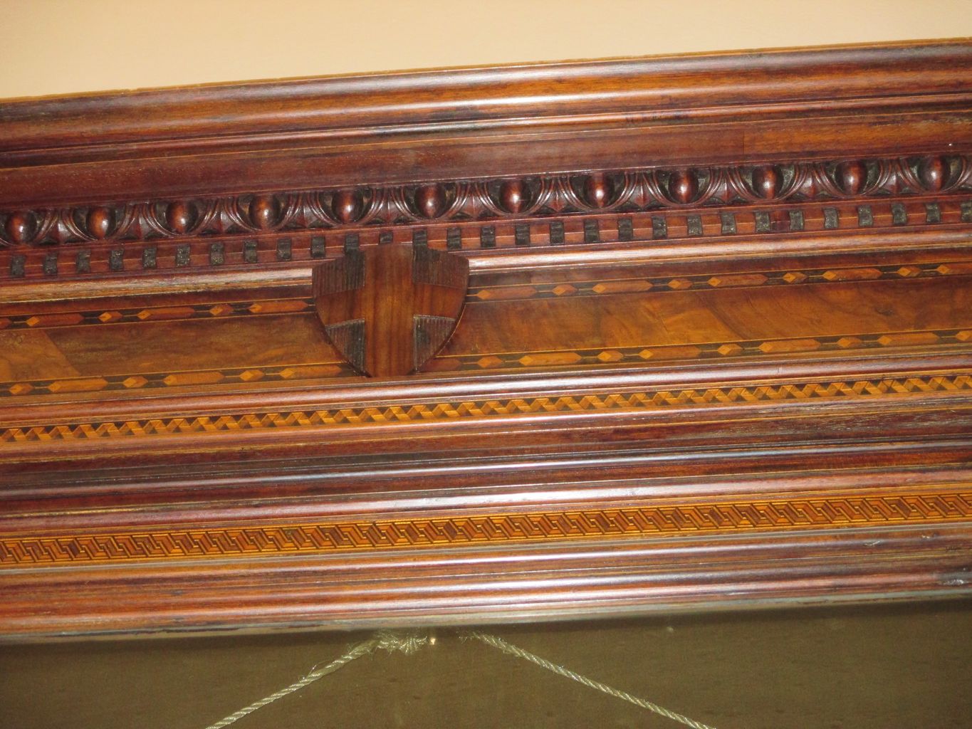 Parte inferiore: base liscia sovrastata da cinque quadrati, rettangoli angolari e rettangoli laterali a intarsio con motivi a nastro; parte superiore: tre lati di vetro, il centrale ad anta unica incorniciata da un motivo intarsiato a nastro stilizzato, i lati corti incorniciati con motivo intarsiato a stella di davide ripetuta; cappello: intarsio a motivi geometrici, dentelli e baccellatura, stemma centrale sabaudo applicato, cornice superiore sporgente