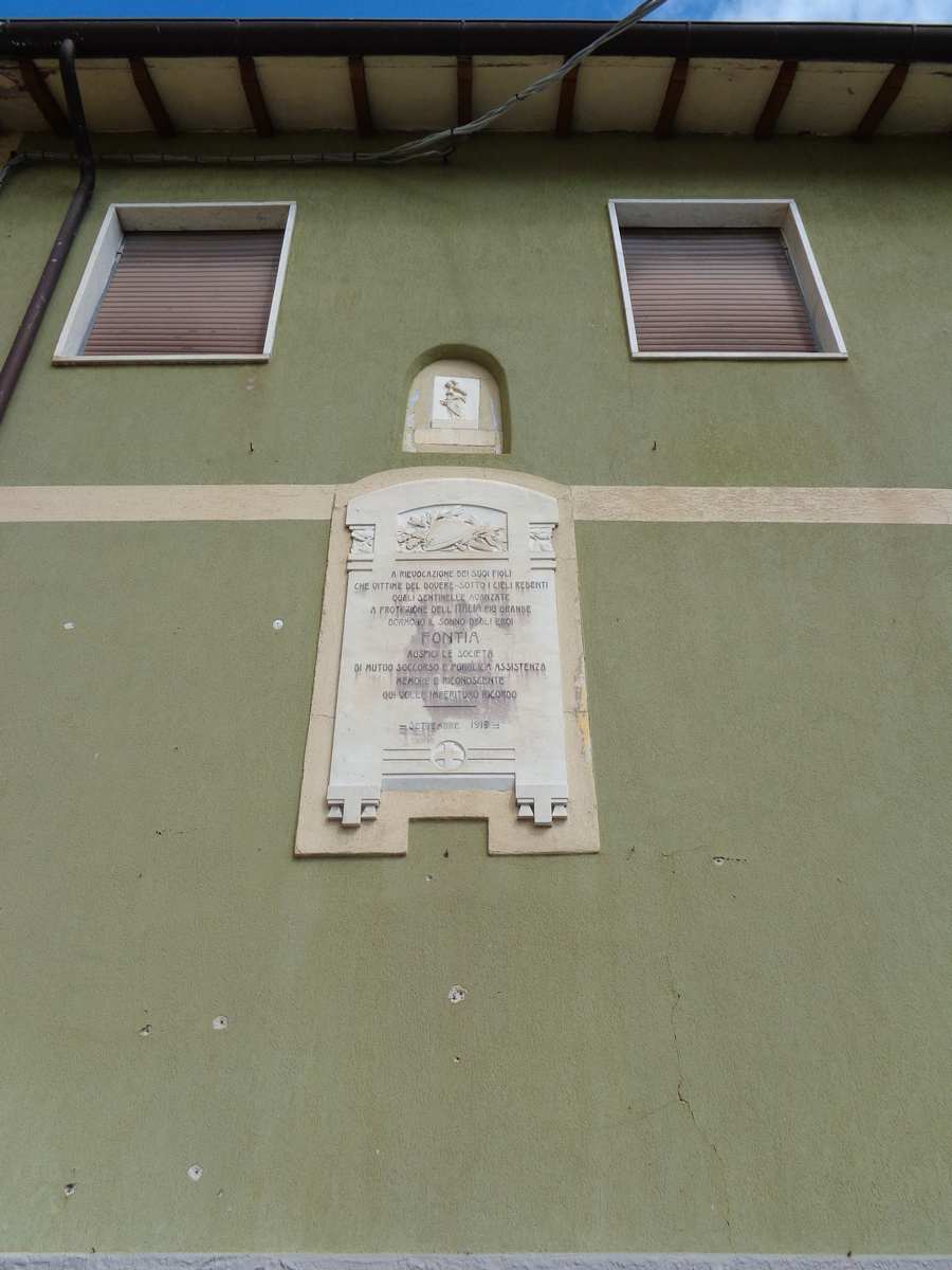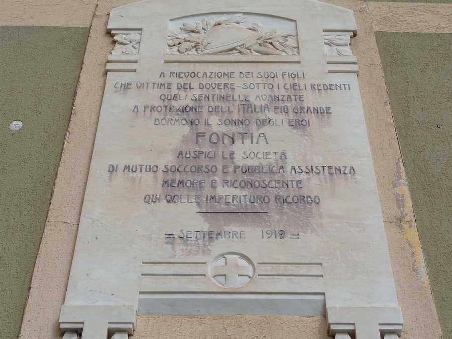 - ISCRIZIONI al centro - A RIEVOCAZIONE DEI SUOI FIGLI/ CHE VITTIME DEL DOVERE SOTTO I CIELI REDENTI/ QUALI SENTINELLE AVANZATE/ A PROTEZIONE DELL’ITALIA PIU’ GRANDE/ DORMONO IL SONNO DEGLI EROI/ FONTIA/ AUSPICI LE SOCIETA’/ DI MUTUO SOCCORSO E PUBBLICA ASSISTENZA/ MEMORE E RICONOSCENTE/ QUI VOLLE IMPERITURO RICORDO/ SETTEMBRE 1919 - capitale -