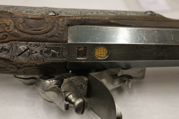 Arma da fuoco portatile. Canna brunita violetto a due ordini, tonda e quadra filettata alla giuntura, internamente traversata da otto righe con 10 mm di distanza tra due pieni; tacca di mira in acciaio