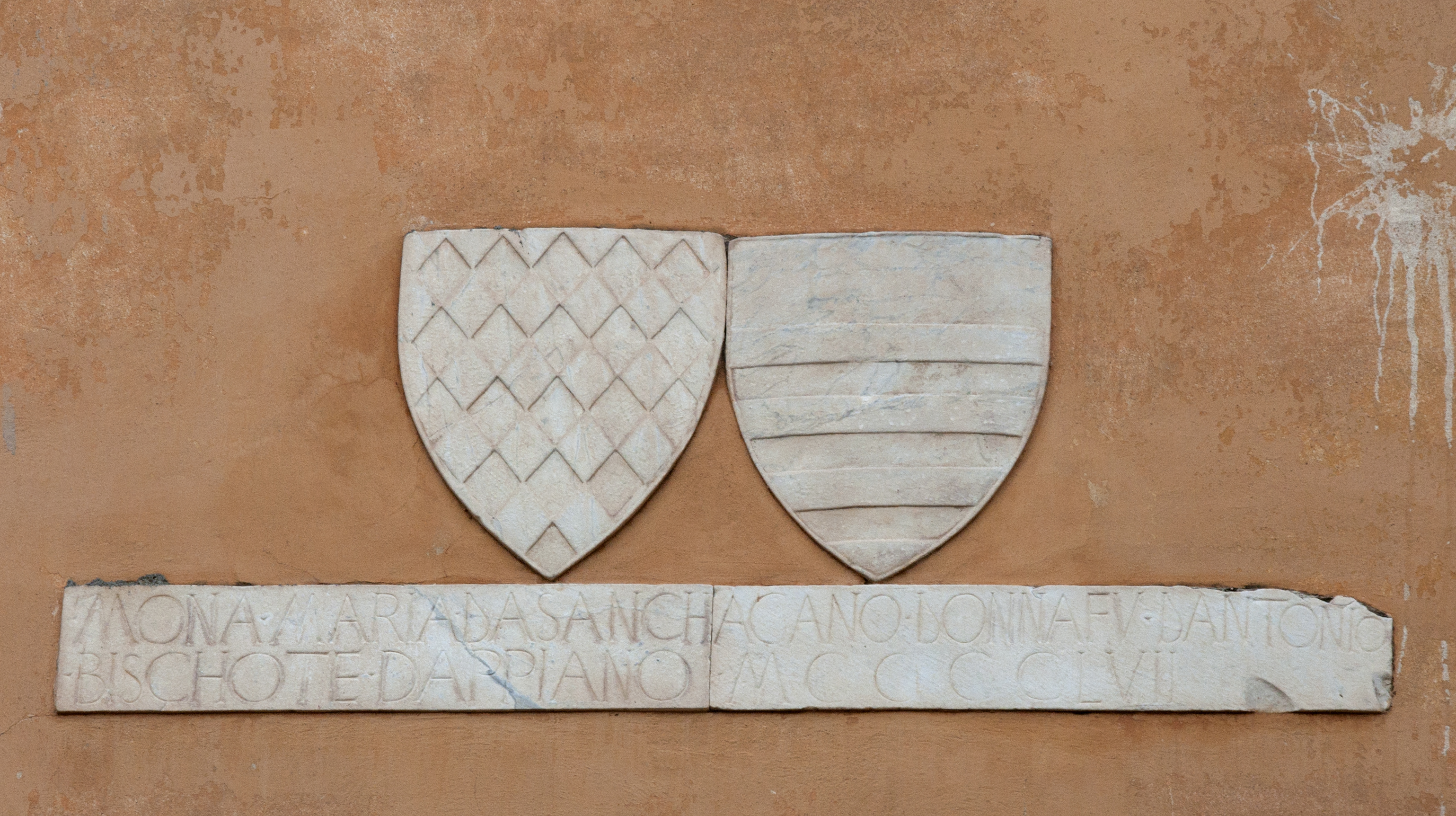 - ISCRIZIONI Lastra sotto gli stemmi - MONA.MARIA.DA.SANCHACANO.DONNA.FV.DANTONIO./ BISCHOTE.DAPPIANO. MCCCCLVII - maiuscolo -