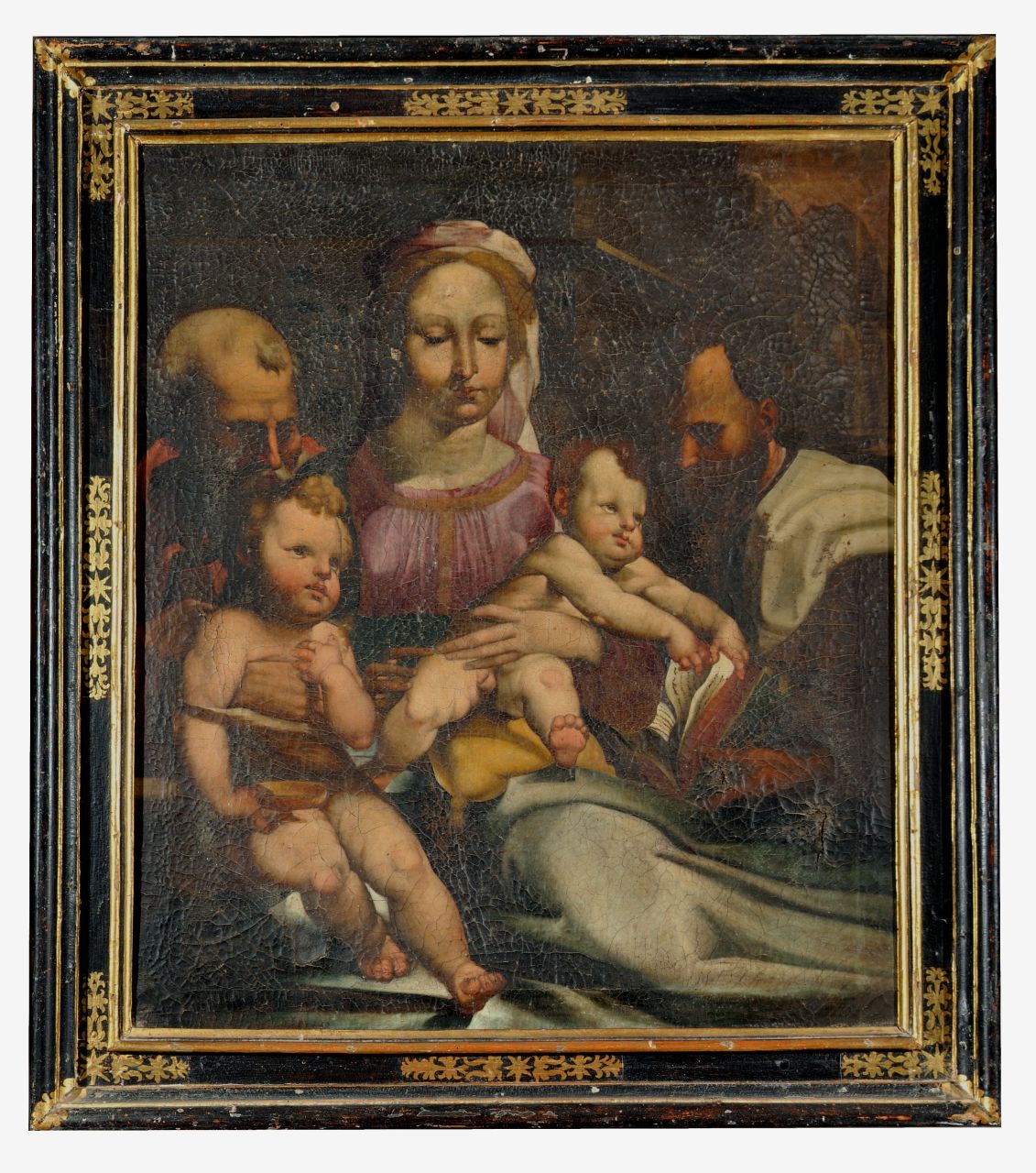 - NOTIZIE STORICO CRITICHE Questo e gli altri dieci dipinti sono stati notificati in quanto inscindibile nucleo collezionistico relativo alla famiglia senese dei Sansedoni, dal cui palazzo affacciato su Piazza del Campo provengono; nel 2015 sono passati in un’asta Pandolfini a Firenze. Il dipinto, copia di un famoso originale di Domenico Beccafumi ora al museo Horne di Firenze, testimonia l'apprezzamento del maestro senese presso le case aristocratiche, che in mancanza di originali dovevano accontentarsi di copie. Sicuramente si tratta del “quadro alto braccia uno e mezzo in circa con cornici gialle dorate esprimente la Madonna e il Bambino e altri S.ti opera della scuola di Mecherino”, che nel 1773 arredava l’appartamento del tesoriere Rutilio nel palazzo di famiglia in Piazza del Campo (cfr. bibliografia). Il copista si direbbe un pittore senese del secondo quarto del Seicento, che risente del luminismo di RUtilio Manetti, a giudicare dal forte contrasto delle ombre, che modifica sostanzialmente i modi pittorici del grande manierista senese. Rispetto al dipinto originale, che è un tondo su tavola, lo sconosciuto copista ha modificato supporto e formato, producendo una tipica tela da stanza seicentesca, che è contenuta in una notevole cornice lignea di tipo senese (cfr. relazione storico-artistica allegata al decreto di vincolo)